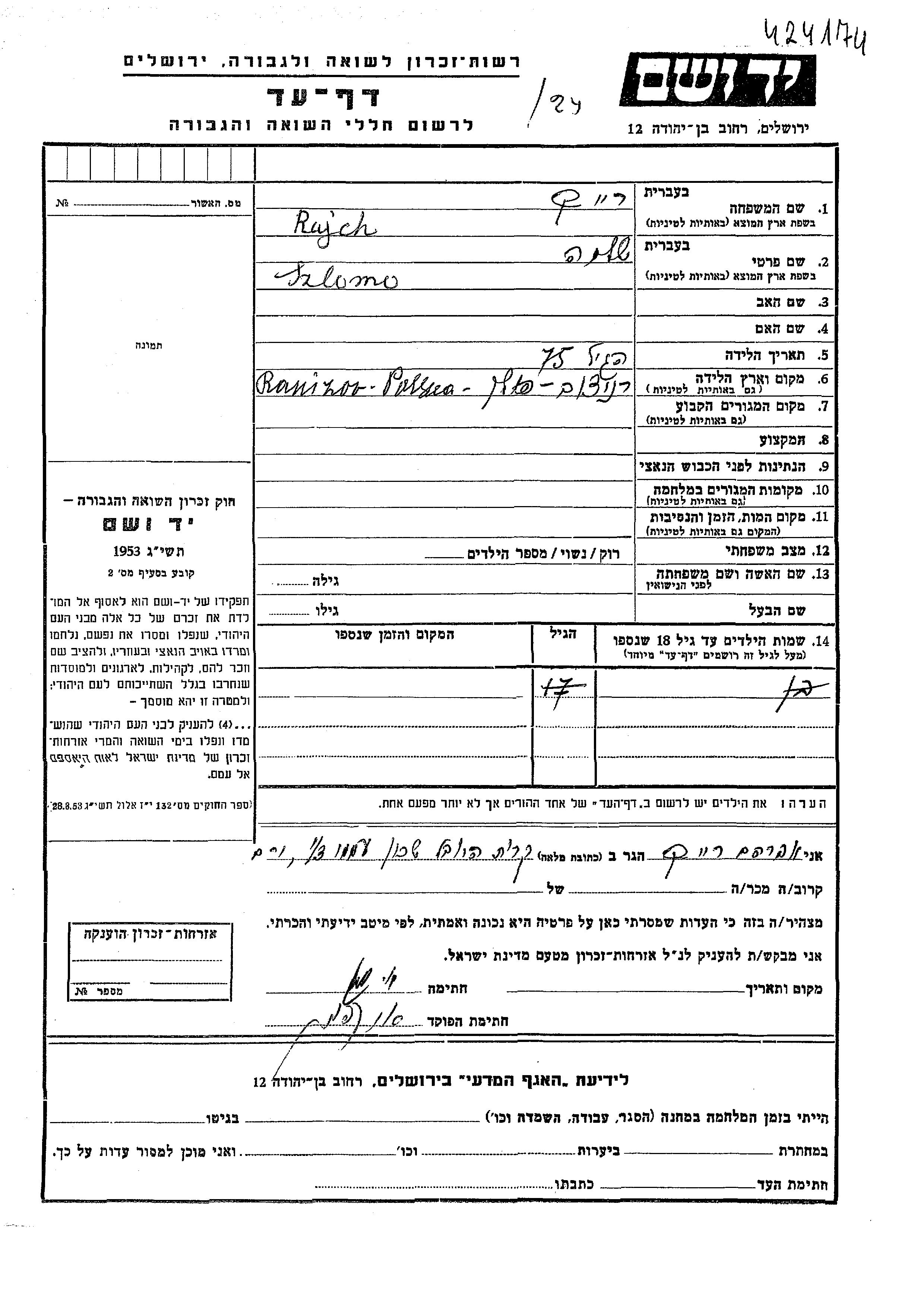 שם פרטי לא ידוע Rajch נולד/ה לSzlomo. הוא/היא היה/היתה ילד/ילדה.