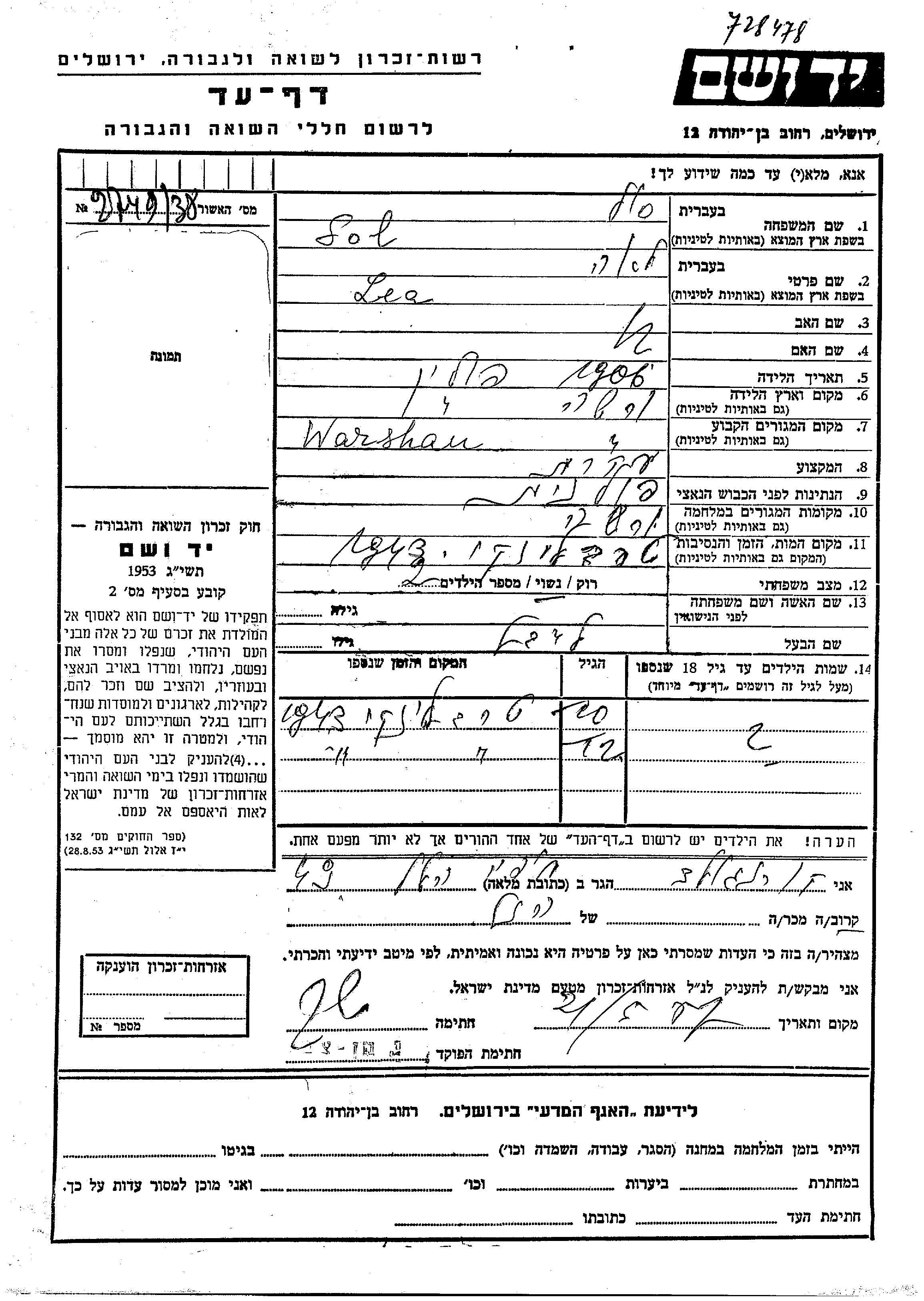 שם פרטי לא ידוע סול נולד/ה ללייבל ולאה. הוא/היא היה/היתה ילד/ילדה. לפני מלחמת העולם השניה התגורר/התגוררה בWarsaw שבפולין. בזמן המלחמה הוא/היא היה/היתה בWarsaw שבפולין.