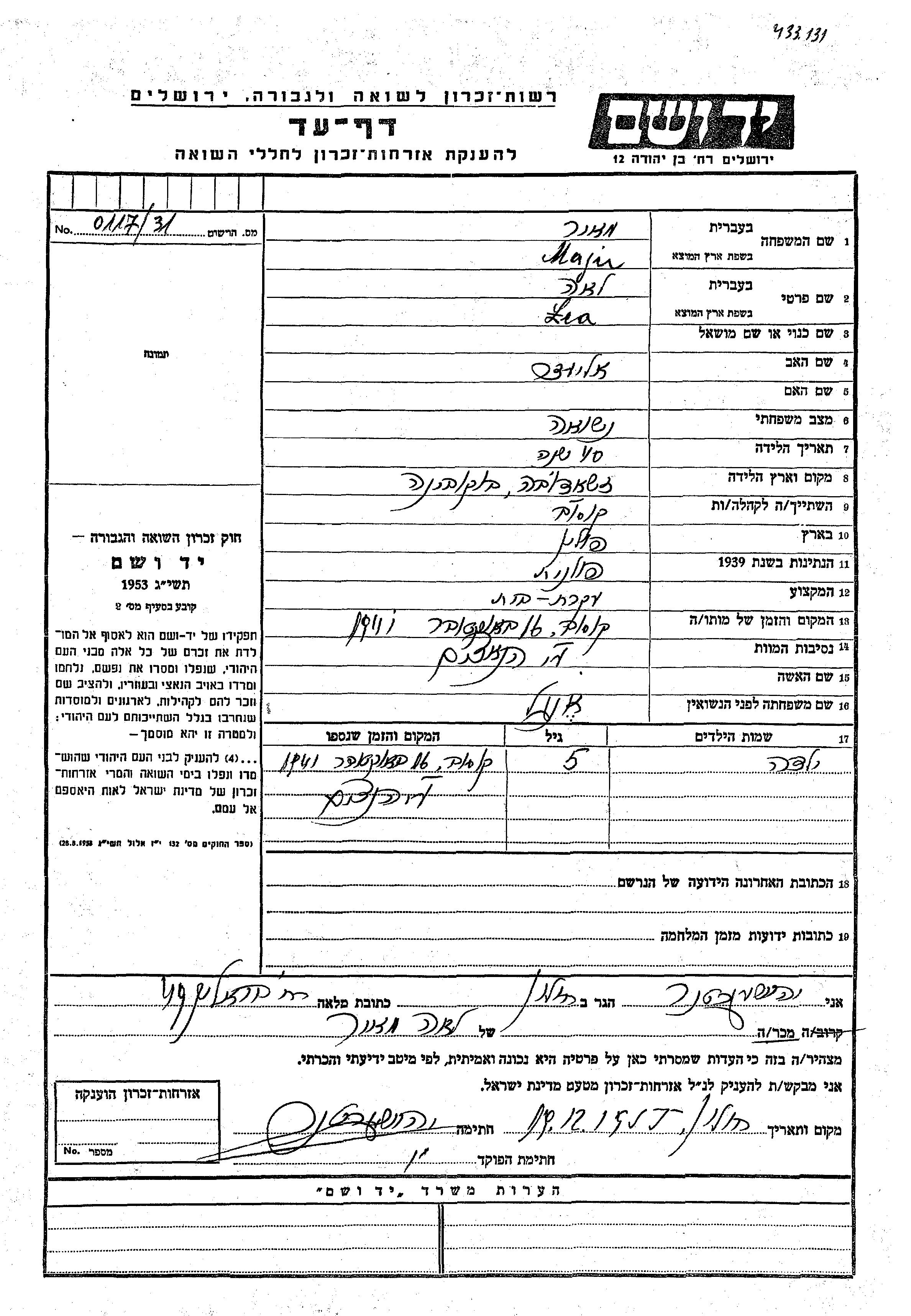עיר/כפר, גטו/מחנה או אתר רצח או מחוז/אזור או מדינה. שם מקום ניתן לחפש רק בא-ב לטיני.