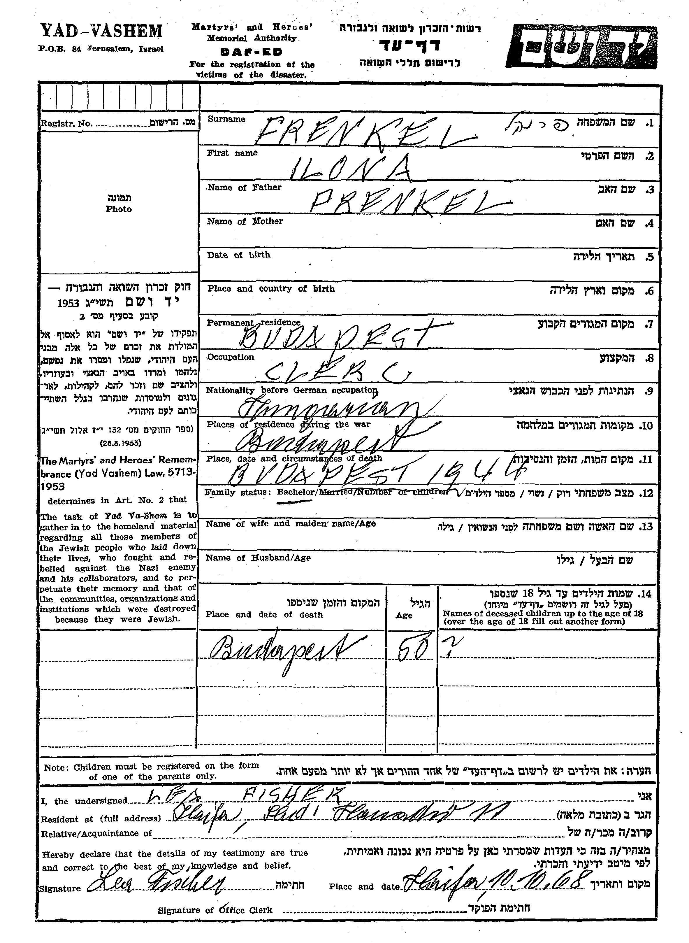 שם פרטי לא ידוע פרנקל נולד/ה לאילונה לבית פרנקל. לפני מלחמת העולם השניה התגורר/התגוררה בBudapest שבהונגריה. בזמן המלחמה הוא/היא היה/היתה בBudapest שבהונגריה.
