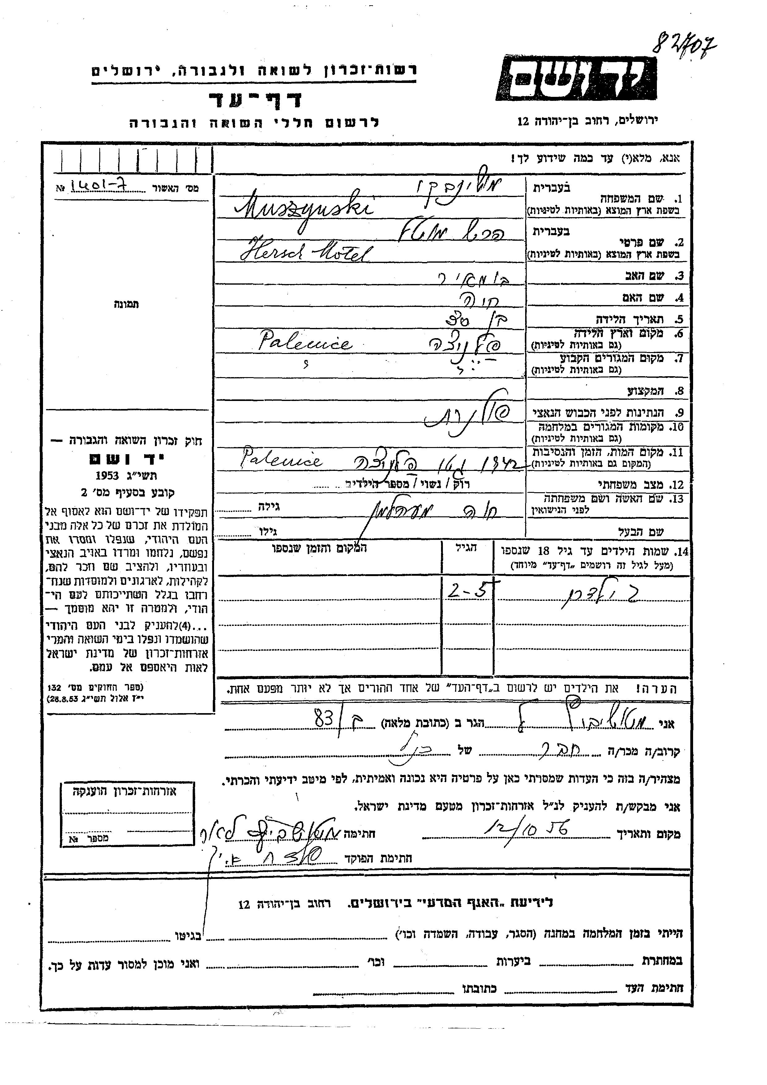 שם פרטי לא ידוע Muszynski נולד/ה לHersch Motel וחוה לבית מעהלמן. הוא/היא היה/היתה ילד/ילדה. לפני מלחמת העולם השניה התגורר/התגוררה בPolenitz שבפולין.