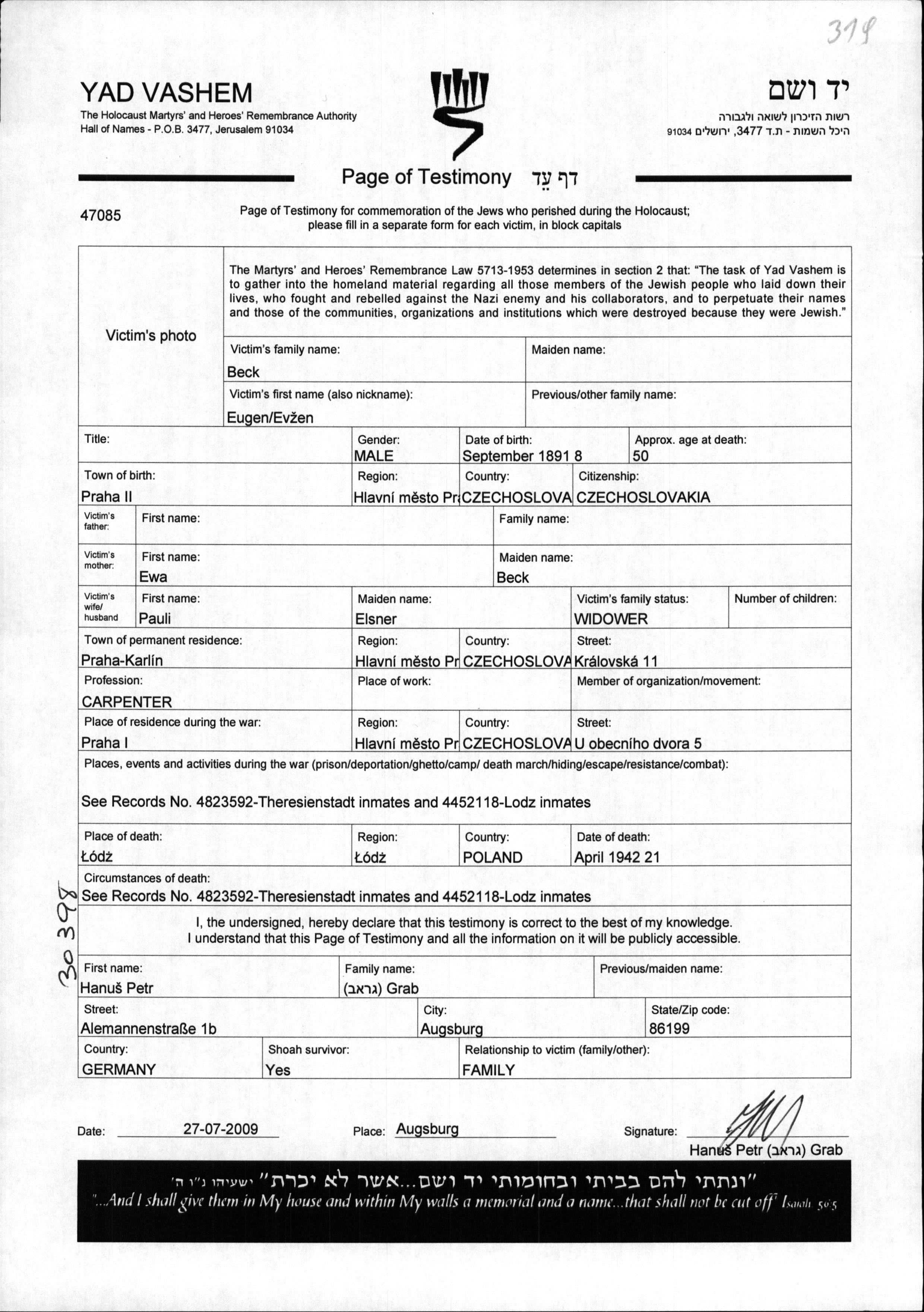אוגן Beck נולד בPraha שבצ'כוסלובקיה בשנת 1891 לEwa לבית Beck. הוא היה נגר ואלמן לPauli לבית אלסנר. לפני מלחמת העולם השניה התגורר בKarlin שבצ'כוסלובקיה. בזמן המלחמה הוא היה בPraha שבצ'כוסלובקיה. אוגן נרצח בשואה. מקום המוות: Lodz שבפולין בשנת 21/04/1942.