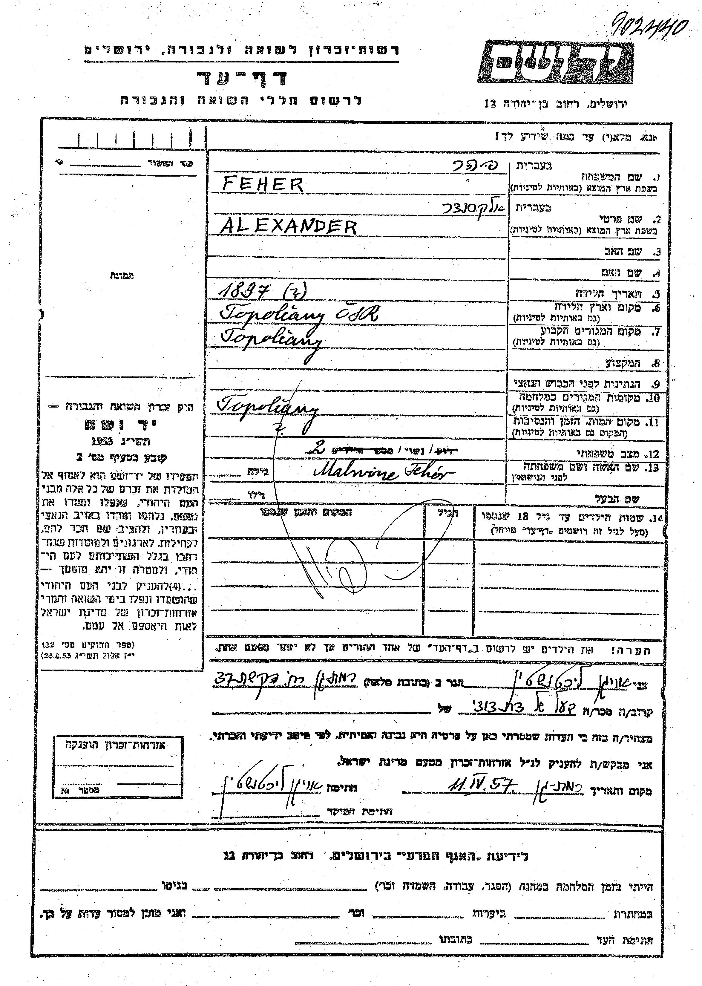 Alexander פהר נולד בTopolcany שבצ'כוסלובקיה בשנת 1897. הוא היה נשוי לMalwine. לפני מלחמת העולם השניה התגורר בTopolcany שבצ'כוסלובקיה. בזמן המלחמה הוא היה בTopolcany שבצ'כוסלובקיה.