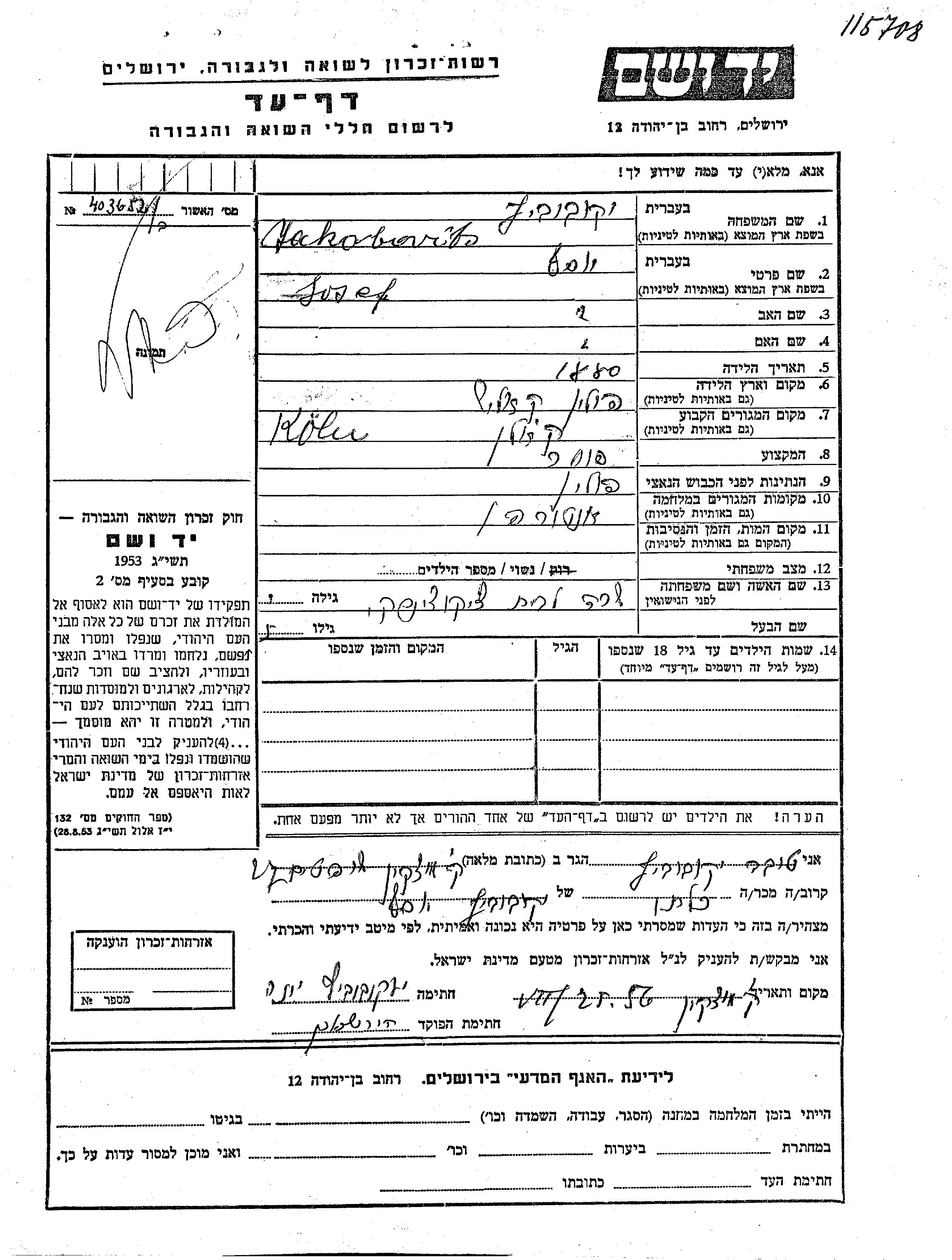 Josef Yakobovits נולד בKalisz שבפולין בשנת 1880. הוא היה סוחר ונשוי לשרה לבית ציקוצינסקי. לפני מלחמת העולם השניה התגורר בKoeln שבגרמניה. בזמן המלחמה הוא היה בAntwerpen שבבלגיה. הוא נרצח בשואה.
