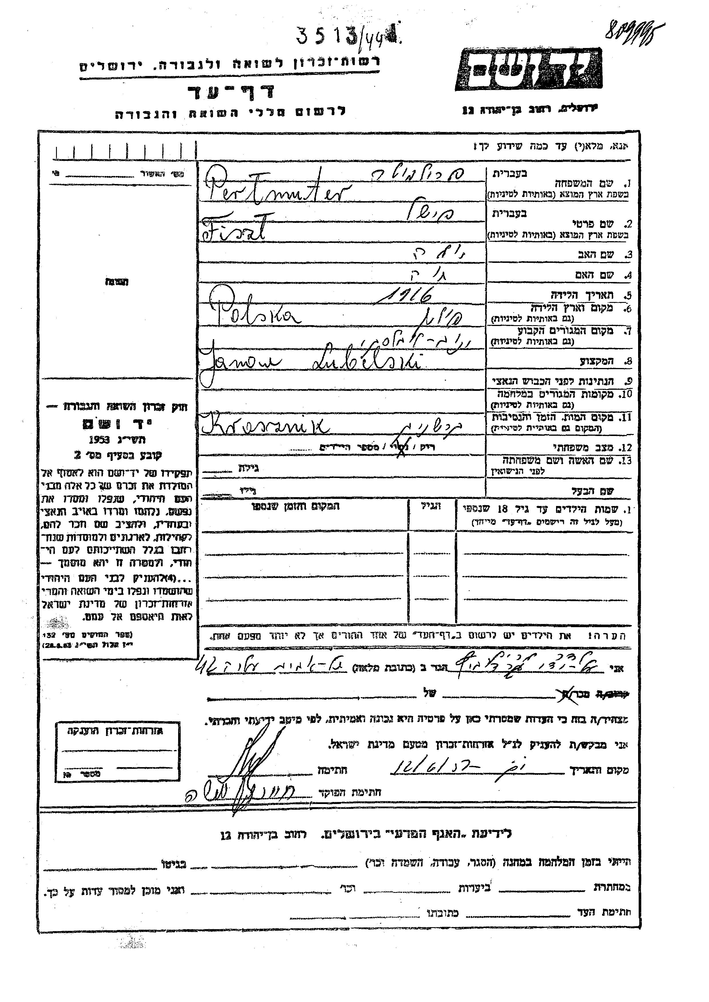 Fiszl פרילמוטר נולד בפולין שבפולין בשנת 1916 לאליה וחיה. הוא היה רווק. לפני מלחמת העולם השניה התגורר בJanow Lubelski שבפולין. הוא נרצח בשואה. מקום המוות: Krasznik שבפולין.