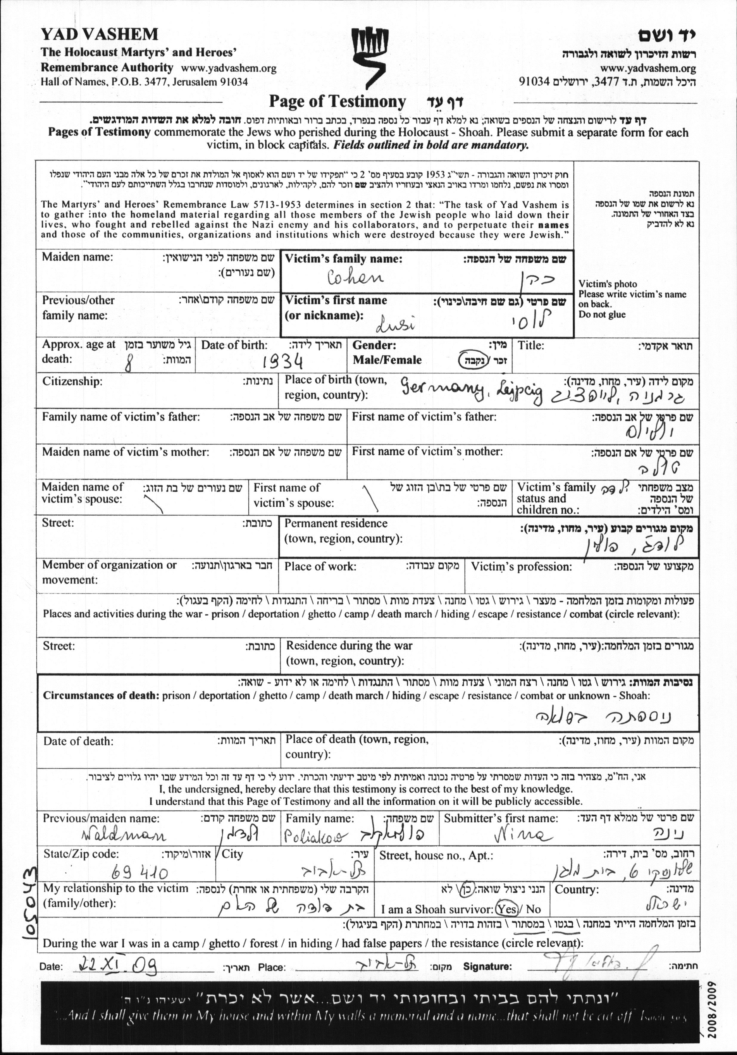 Lusi Cohen נולדה בLeipzig שבגרמניה בשנת 1934 ליוליוס וטולה. היא היתה ילדה. לפני מלחמת העולם השניה התגוררה בLodz שבפולין.