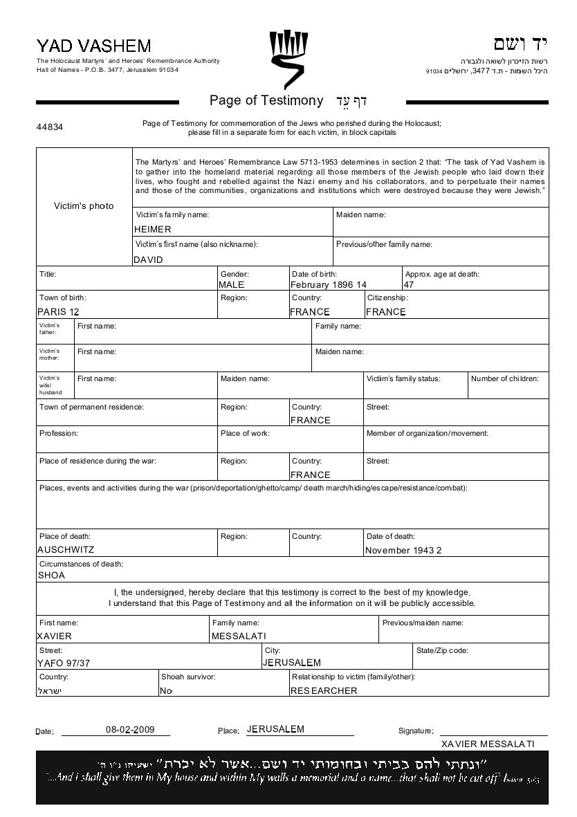 דוד נרצח בשואה. מקום המוות: Auschwitz שבפולין בשנת 02/11/1943.