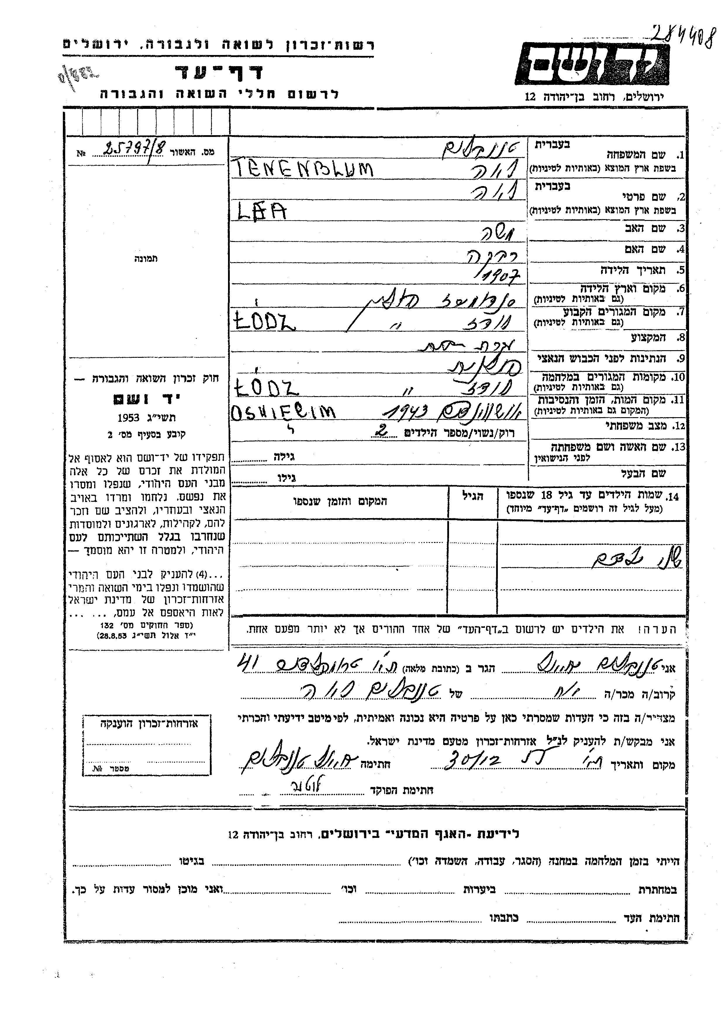 לאה טננבלום נולדה בSandomierz שבפולין בשנת 1907 למשה ורבקה. היא היתה עקרת בית ונשואה. לפני מלחמת העולם השניה התגוררה בLodz שבפולין. בזמן המלחמה היא היתה בLodz שבפולין. לאה נרצחה בשואה. מקום המוות: Auschwitz שבפולין בשנת 1943.