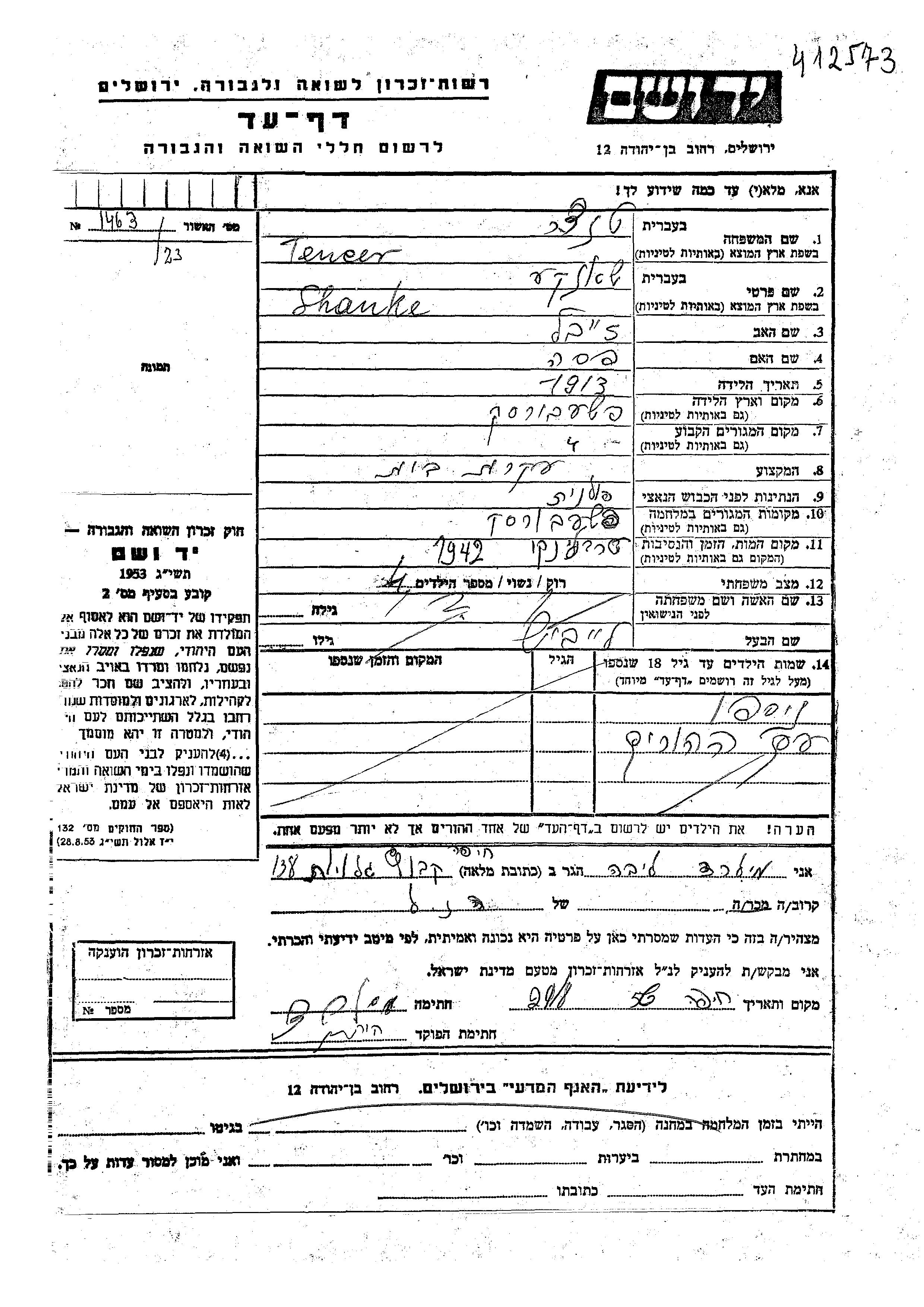 Shanke שאנקע Tencer נולדה בPszeworsk שבפולין בשנת 1913 לזייבל ופסה. היא היתה עקרת בית ונשואה ללייביש. לפני מלחמת העולם השניה התגוררה בPszeworsk שבפולין. בזמן המלחמה היא היתה בPszeworsk שבפולין.
