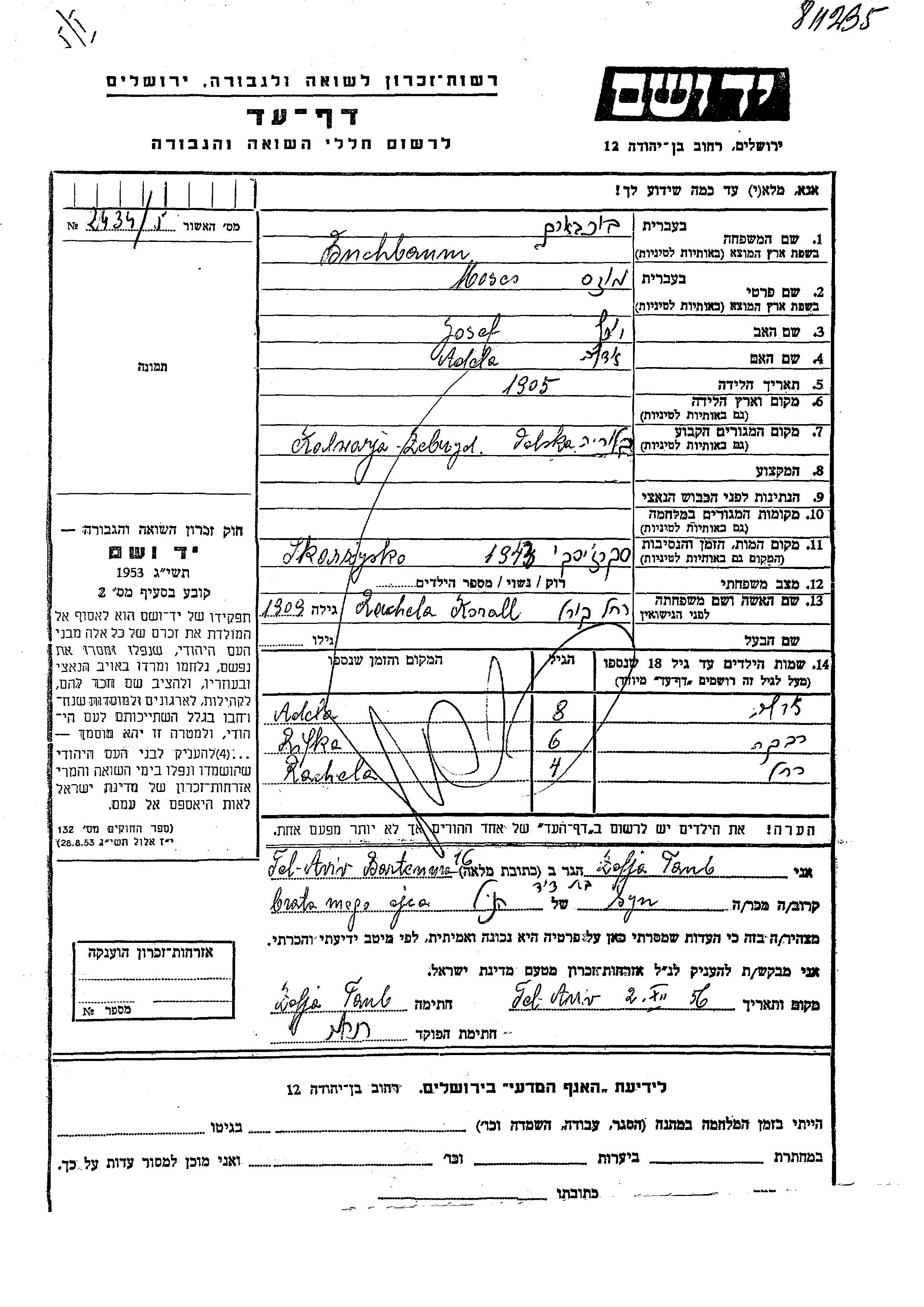 Moses Buchbaum נולד בשנת 1905 ליוסף ואדלה. הוא היה נשוי לRachela לבית Korall. לפני מלחמת העולם השניה התגורר בKalwarja Zebrzydowska שבפולין. הוא נרצח בשואה. מקום המוות: Skarzysko Kamienna שבפולין בשנת 1943.
