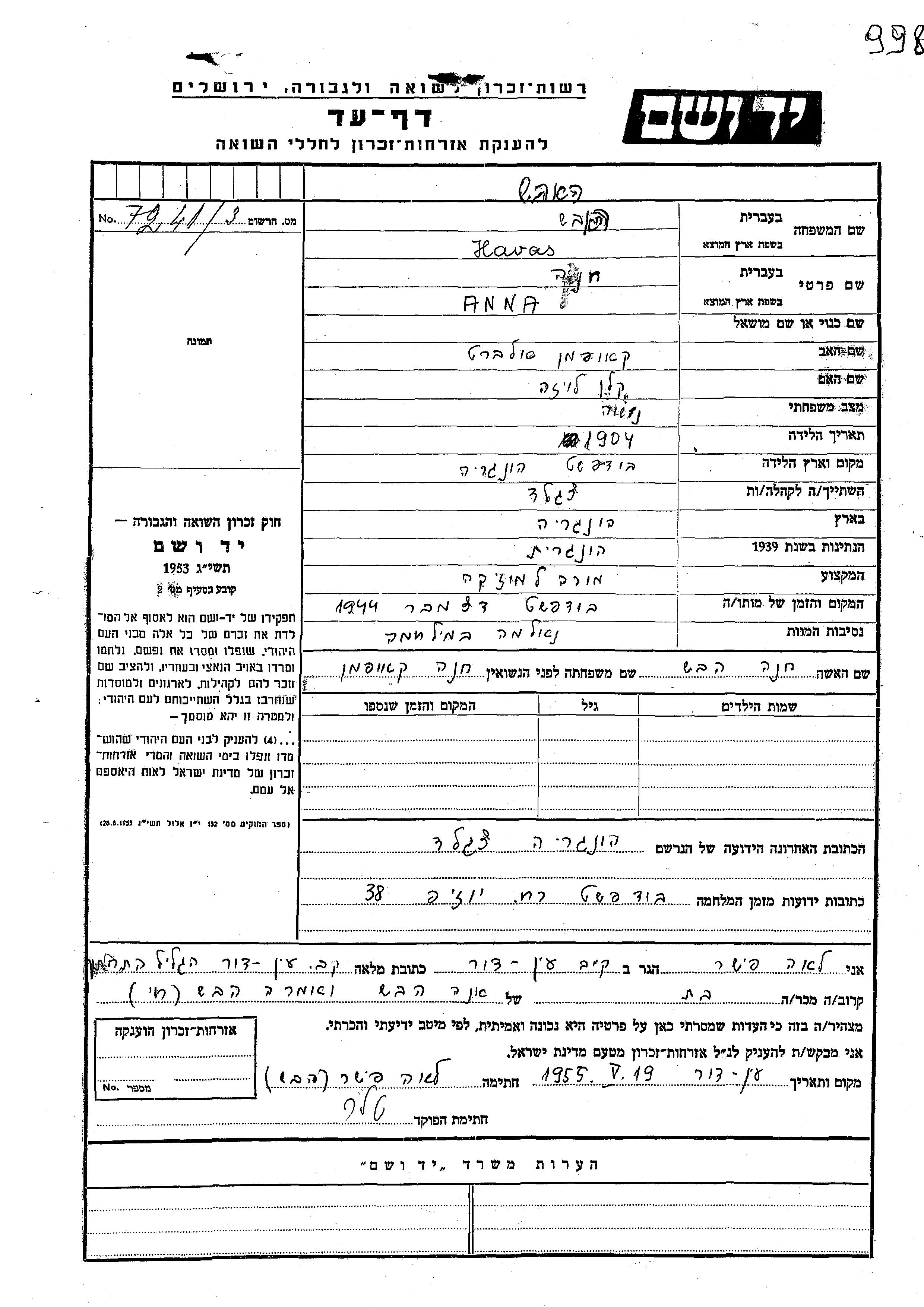 אנה חנה Havas לבית קאופמן נולדה בBudapest שבהונגריה בשנת 1904 לאלברט ולויזה. היא היתה מורה למוסיקה. לפני מלחמת העולם השניה התגוררה בCegled שבהונגריה. בזמן המלחמה היא היתה בBudapest שבהונגריה. אנה חנה נרצחה בשואה. מקום המוות: Budapest שבהונגריה בשנת 12/1944.