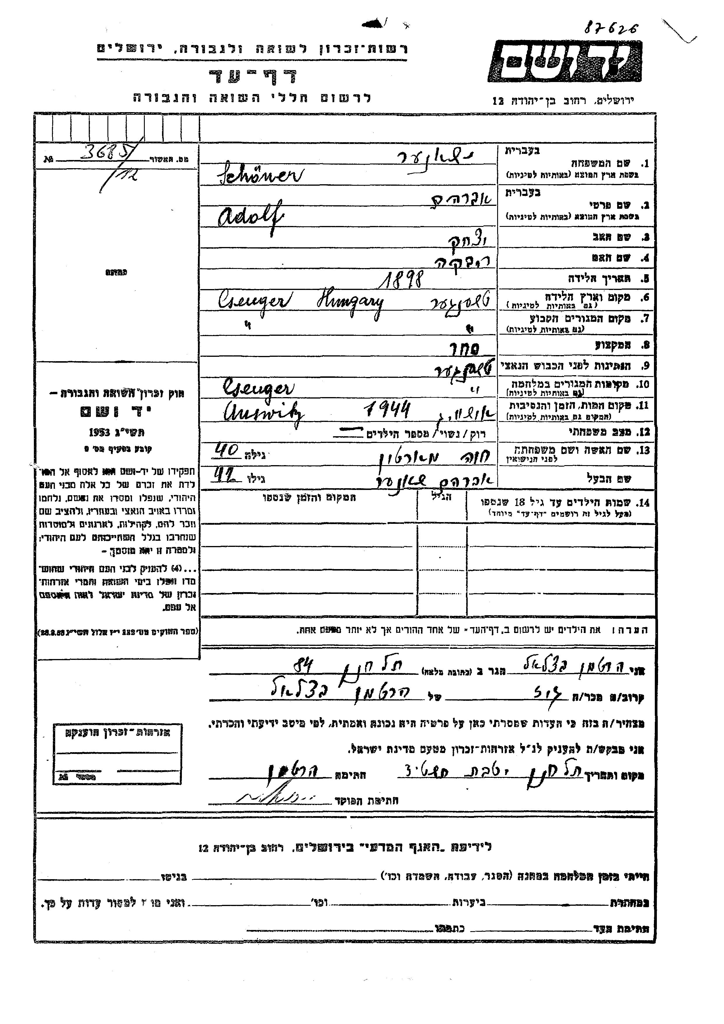 אדולף אברהם Schoener נולד בCsenger שבהונגריה בשנת 1898 ליצחק ורבקה. הוא היה סוחר ונשוי לחוה לבית מארטון. לפני מלחמת העולם השניה התגורר בCsenger שבהונגריה. בזמן המלחמה הוא היה בCsenger שבהונגריה. אדולף אברהם נרצח בשואה. מקום המוות: Auschwitz שבפולין בשנת 1944.