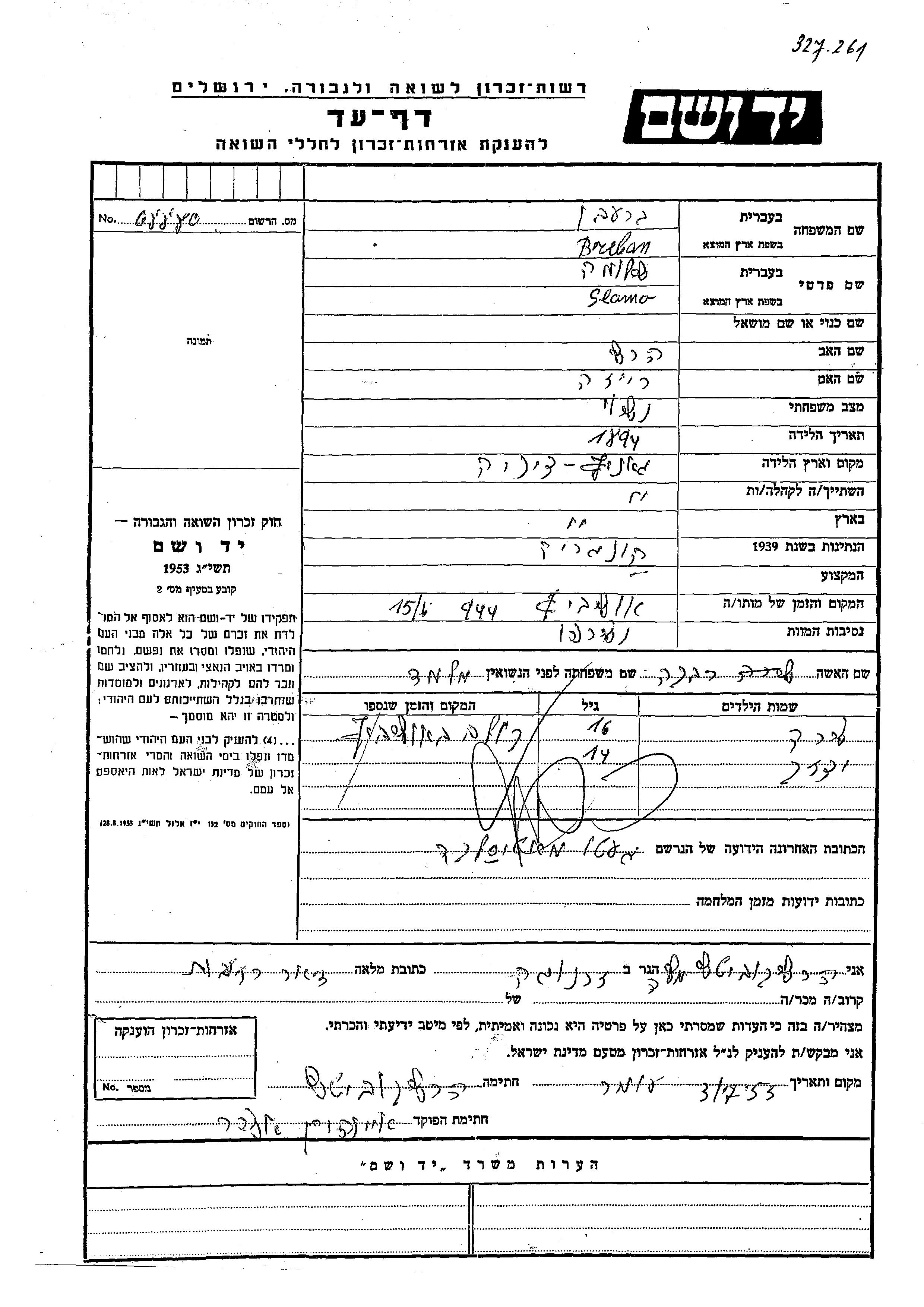 Slomo ברבן נולד בGanice שבצ'כוסלובקיה בשנת 1894 להרש ורייזה. הוא היה נשוי לרבקה לבית מלמד. לפני מלחמת העולם השניה התגורר בGanice שבצ'כוסלובקיה. בזמן המלחמה הוא היה בMateszalka שבהונגריה. הוא נרצח בשואה. מקום המוות: Auschwitz שבפולין בשנת 15/06/1944.