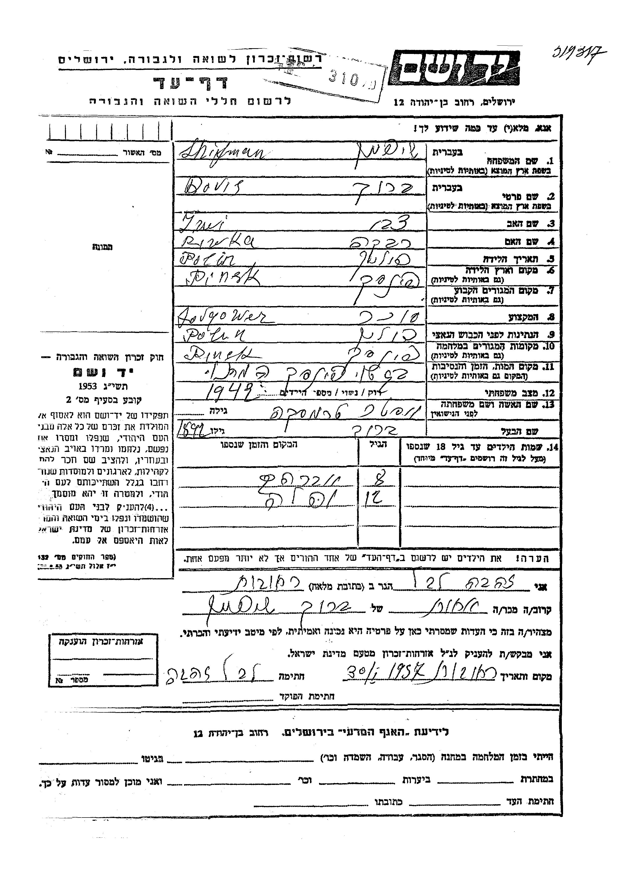 חיפוש שם מוסר דף העד. חיפוש לפי כל שם פרטי, כולל כינוי או שם חיבה