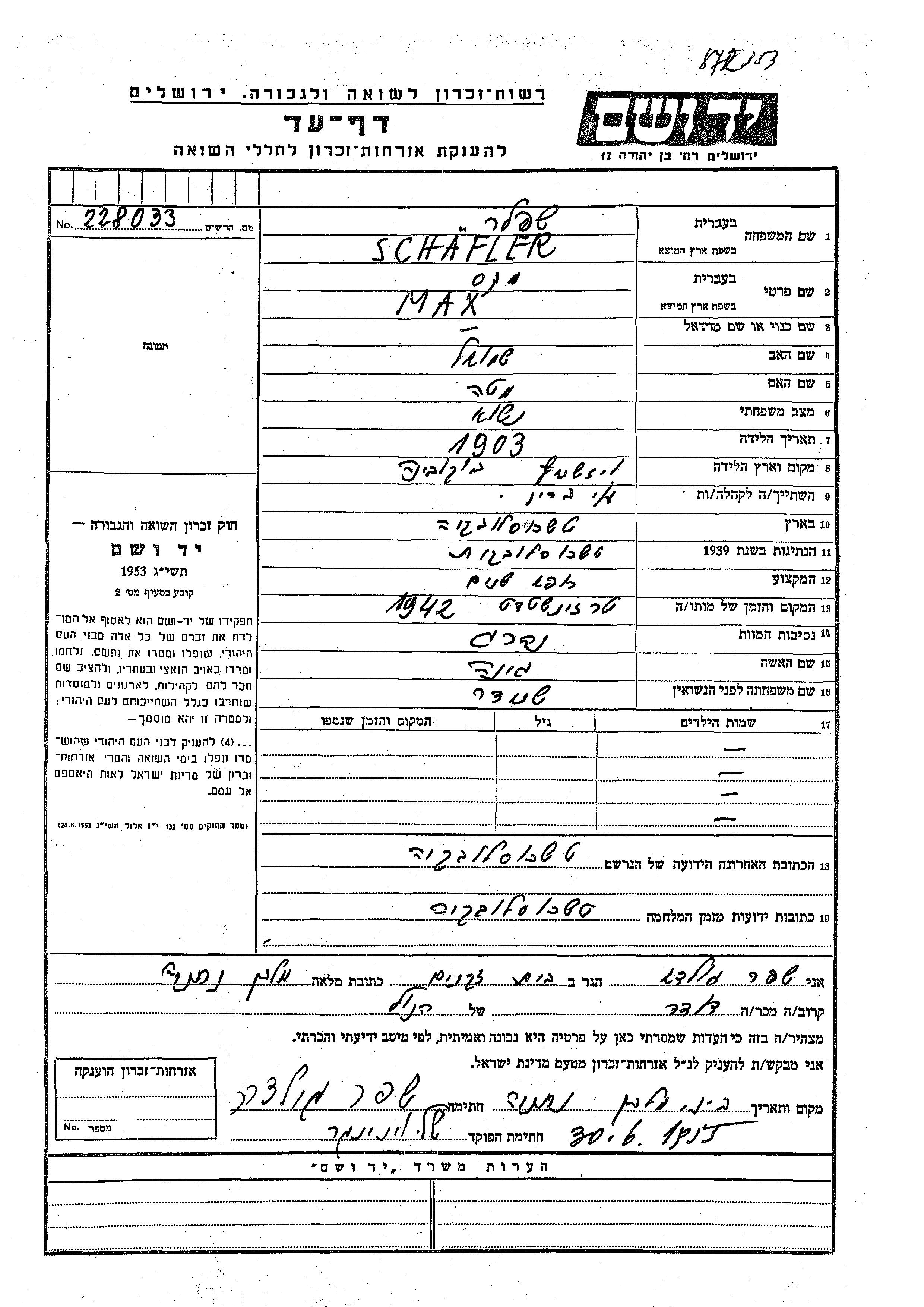 מקס Schafler נולד בVijnita שברומניה בשנת 1903 לשמואל ומטה. הוא היה רופא שיניים ונשוי לגינה לבית שנידר. לפני מלחמת העולם השניה התגורר בצ'כוסלובקיה. בזמן המלחמה הוא היה בצ'כוסלובקיה. מקס נרצח בשואה. מקום המוות: צ'כוסלובקיה בשנת 1942.
