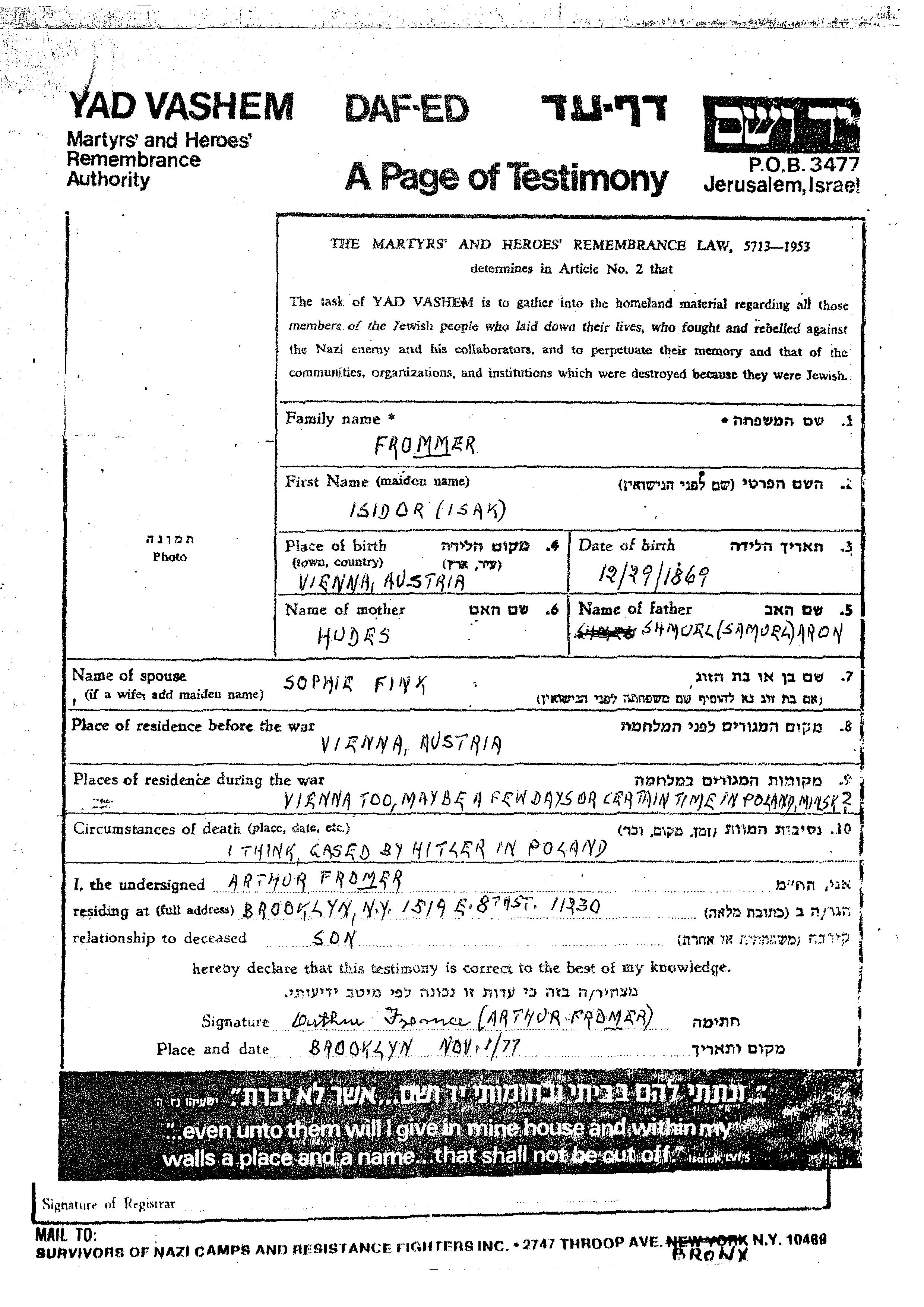Isidor איסק Frommer נולד בVienna שבאוסטריה בשנת 1869 לShmoel והודס. הוא היה נשוי לSophie לבית פינק. לפני מלחמת העולם השניה התגורר בVienna שבאוסטריה. בזמן המלחמה הוא היה בMinsk שבביאלורוסיה (ברה"מ). הוא נרצח בשואה. מקום המוות: פולין.