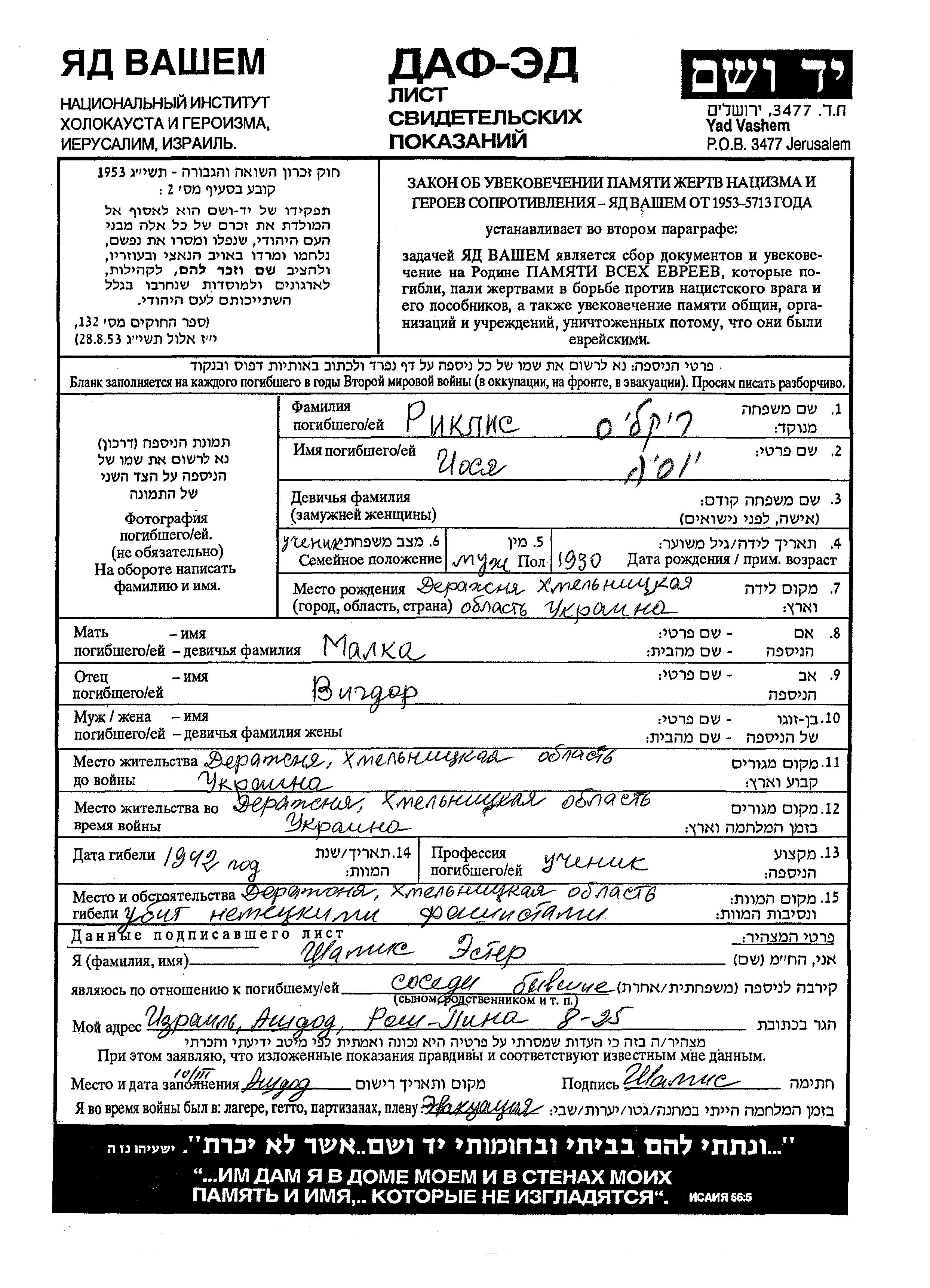 יוסיה נרצח בשואה. מקום המוות: Derazhnya שבאוקראינה (ברה"מ) בשנת 1942.