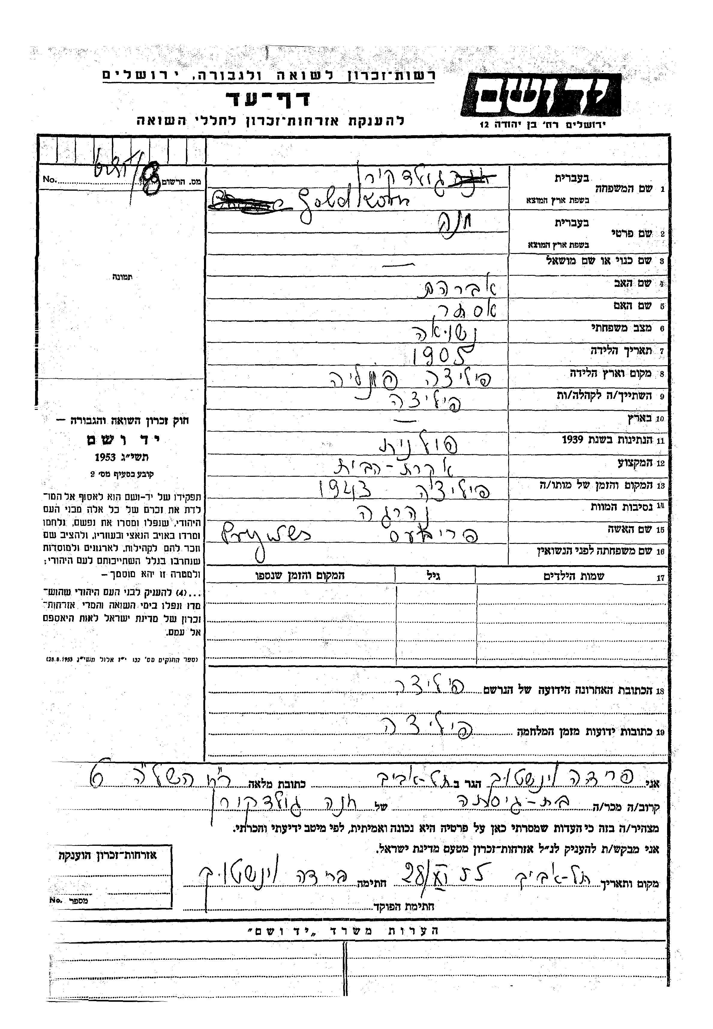 חנה גולדקורן לבית Prywes נולדה בPilica שבפולין בשנת 1905 לאברהם ואסתר. היא היתה עקרת בית ונשואה. בזמן המלחמה היא היתה בPilica שבפולין. חנה נרצחה בשואה. מקום המוות: Pilica שבפולין בשנת 1943.