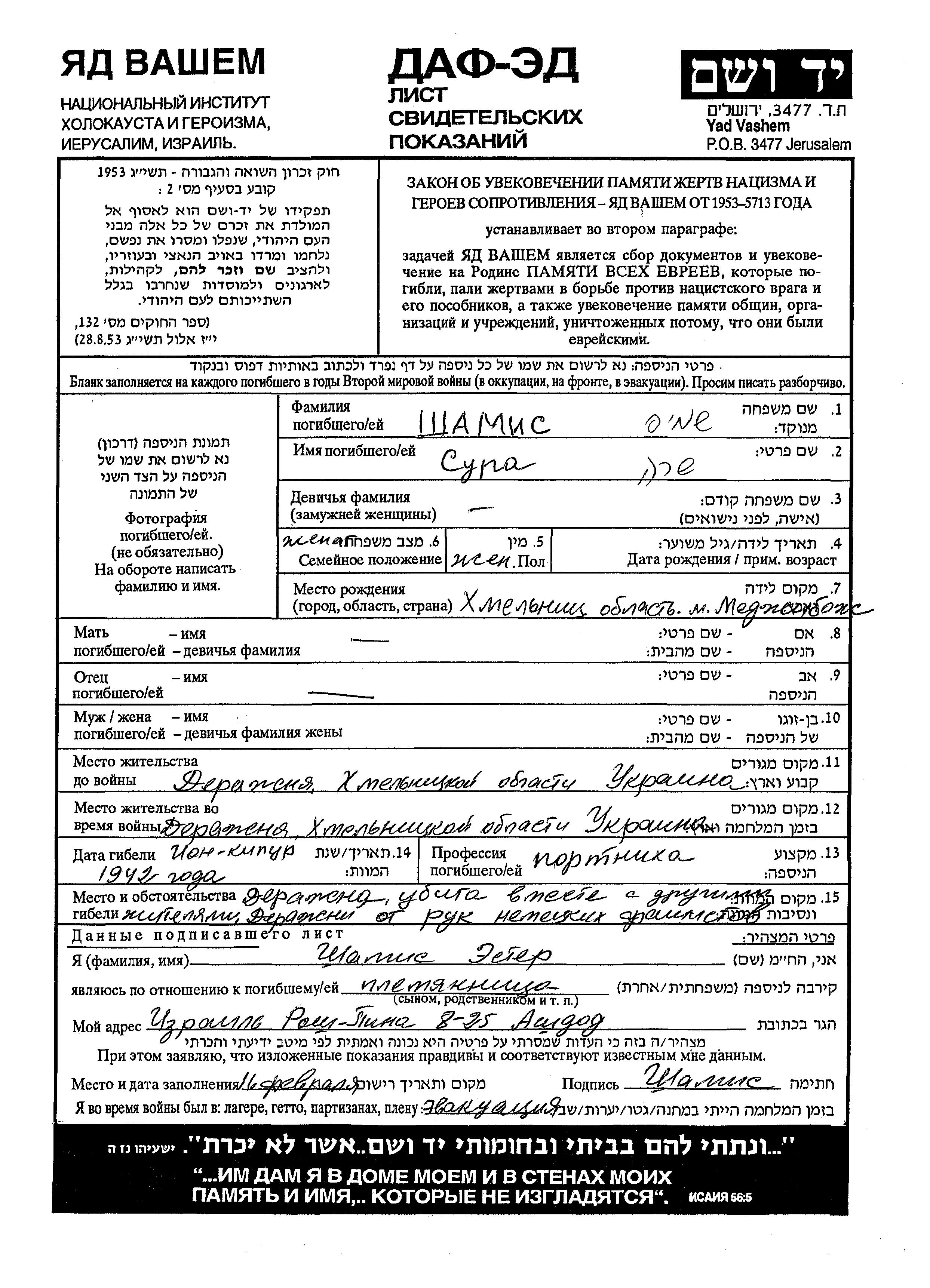 יד ושם - המפעל להנצחת השמות בדפי עד
