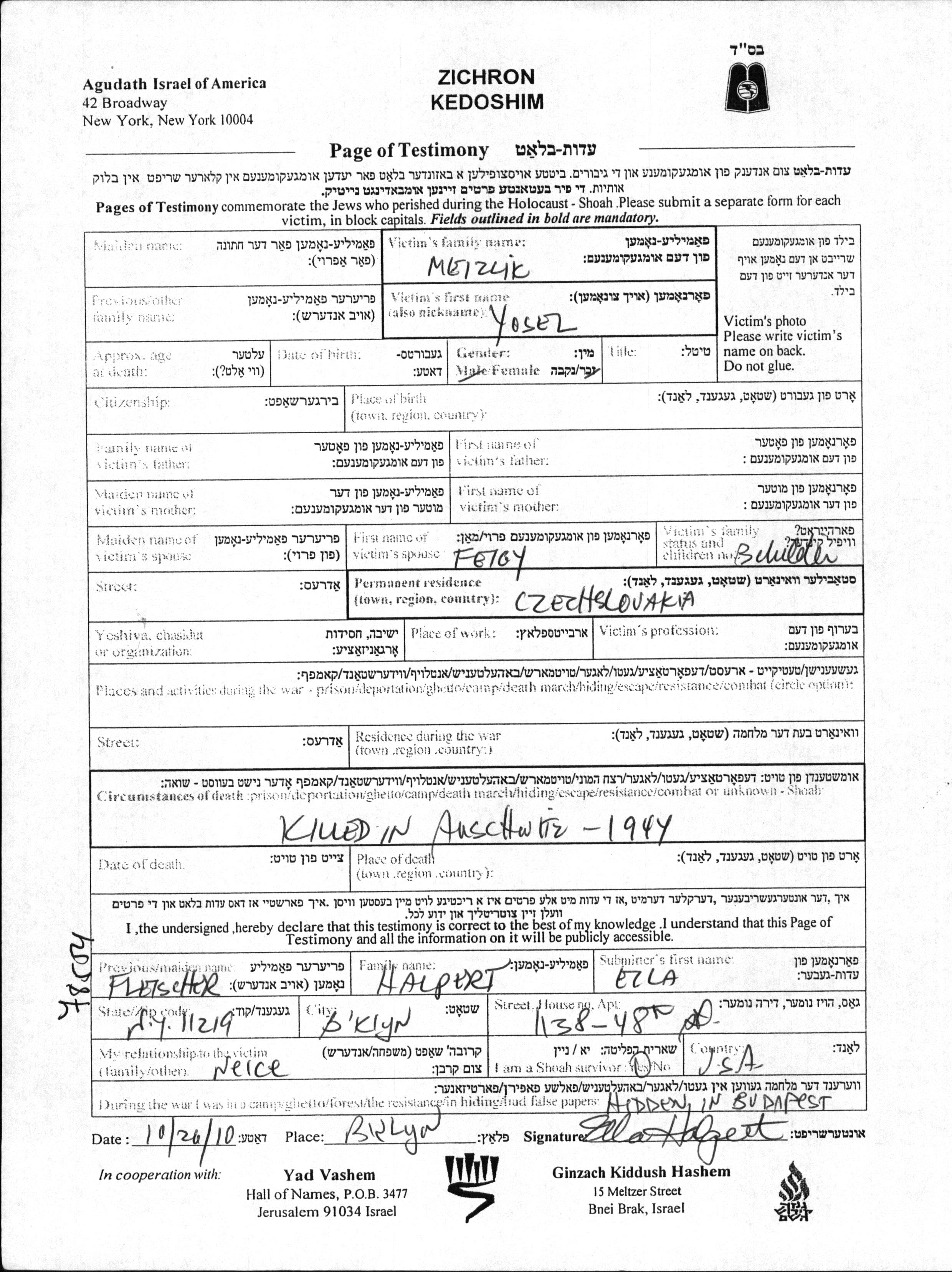 Yosel מייזליק. הוא היה נשוי לFeigy. לפני מלחמת העולם השניה התגורר בצ'כוסלובקיה.