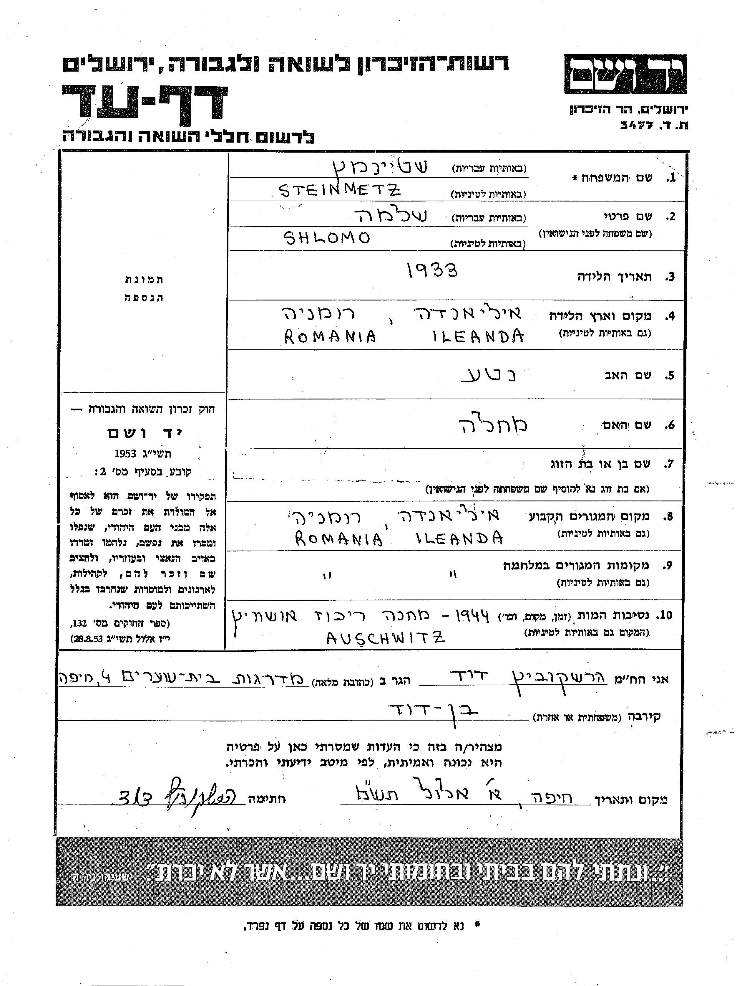 שלמה Steinmetz נולד בIleanda שברומניה בשנת 1933 לנטע ומחלה. לפני מלחמת העולם השניה התגורר בIleanda שברומניה. בזמן המלחמה הוא היה בIleanda שברומניה.