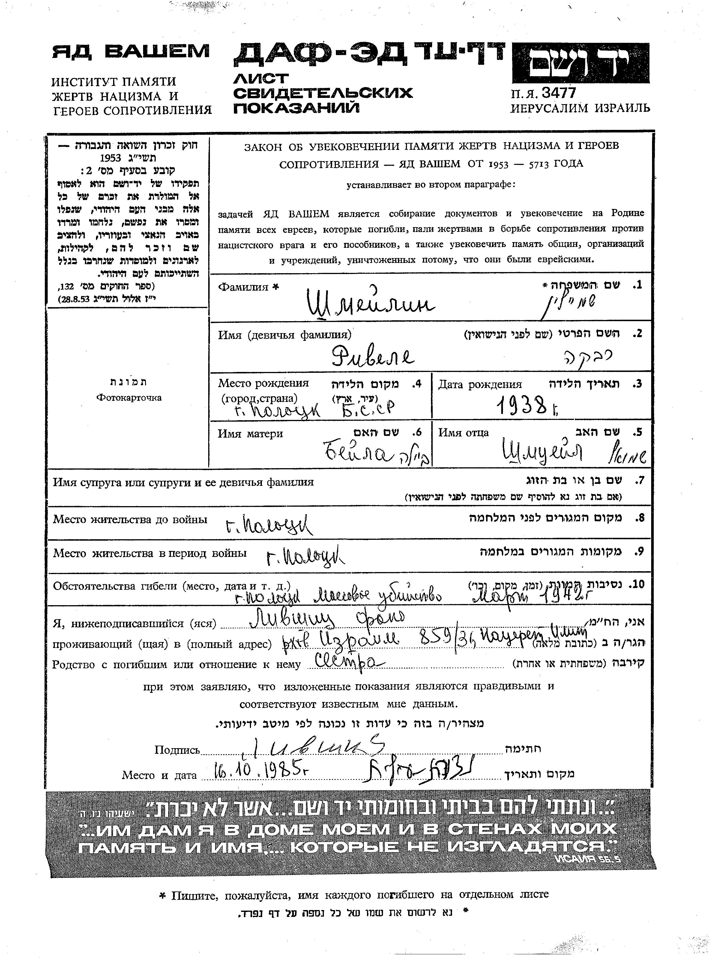 היא נרצחה בשואה. מקום המוות: Polock שבביאלורוסיה (ברה"מ) בשנת 03/1942.