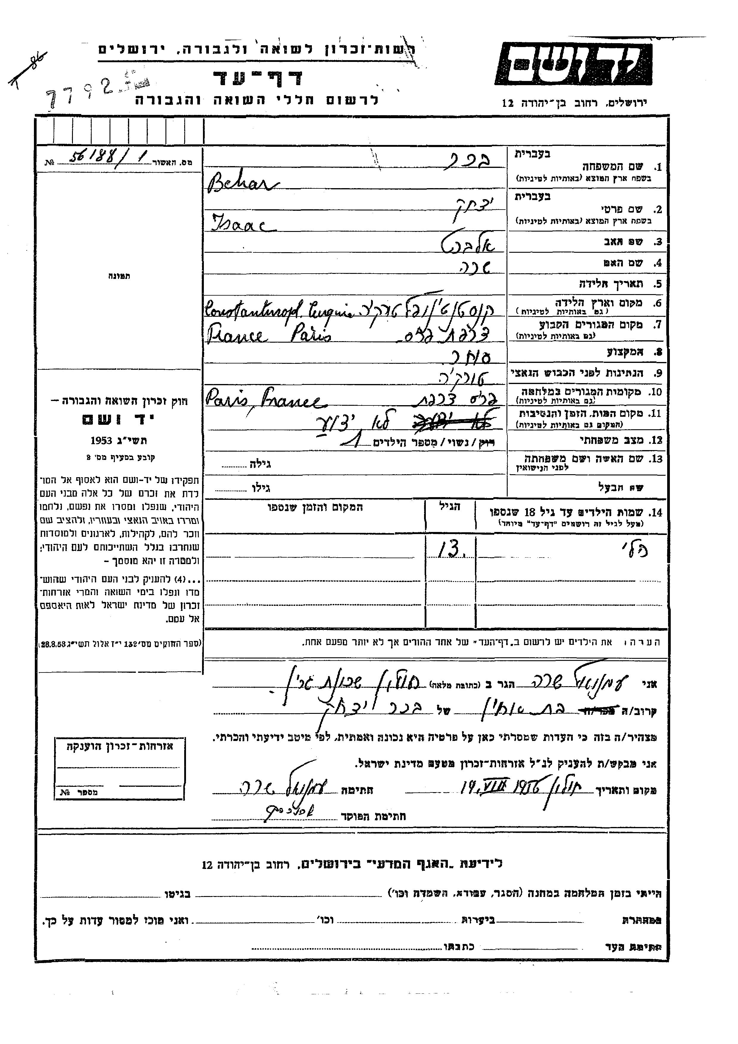 Jsaac בהר בכר נולד בCostantinopoli שבטורקיה לאלברט ושרה. הוא היה סוחר ונשוי. לפני מלחמת העולם השניה התגורר בParis שבצרפת. בזמן המלחמה הוא היה בParis שבצרפת. הוא נרצח בשואה.