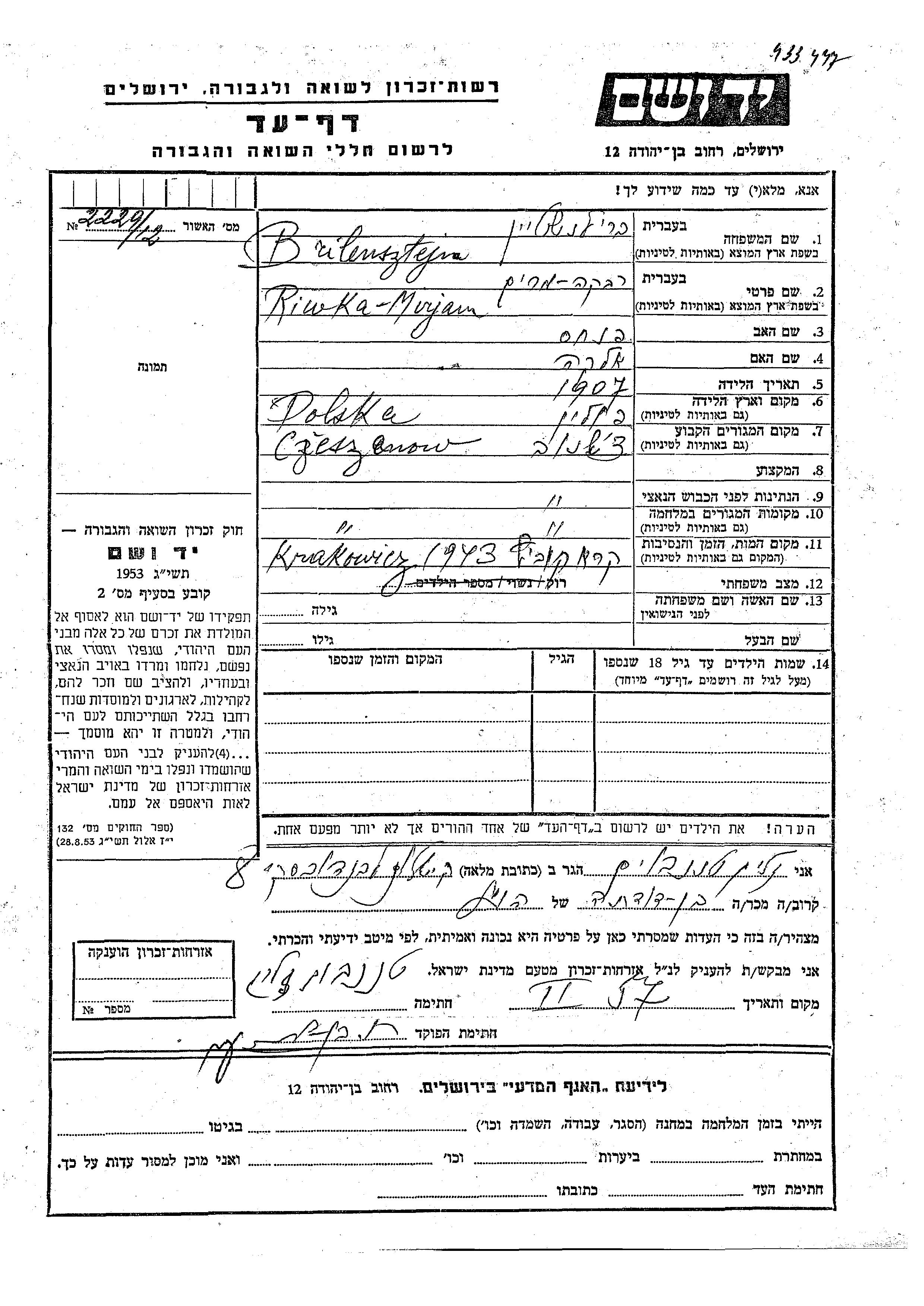 Brilensztejin Riwka Miryam 1907 Cieszanow, פולין דף-עד