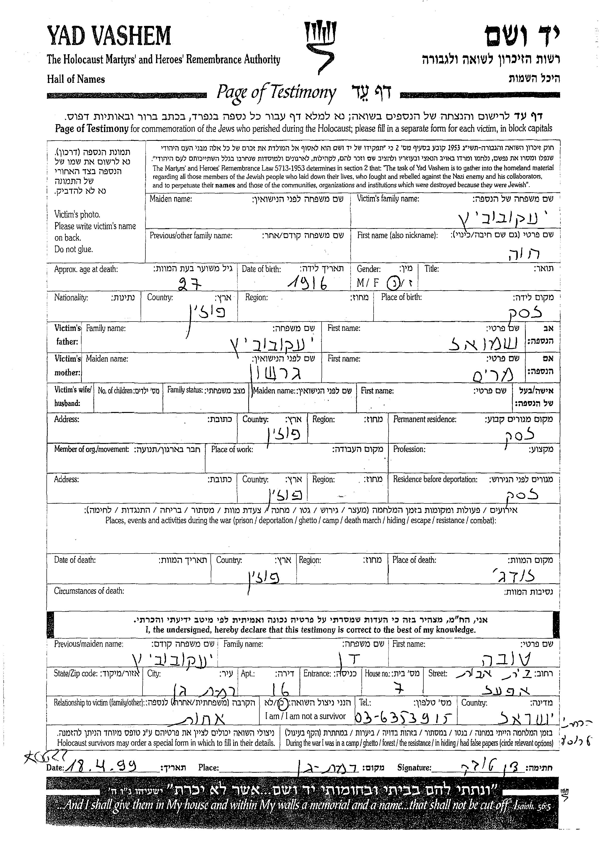 חוה יעקובוביץ נולדה בLask שבפולין בשנת 1916 לשמואל ומרים. לפני מלחמת העולם השניה התגוררה בLask שבפולין. בזמן המלחמה היא היתה בLask שבפולין. חוה נרצחה בשואה. מקום המוות: Lodz שבפולין.