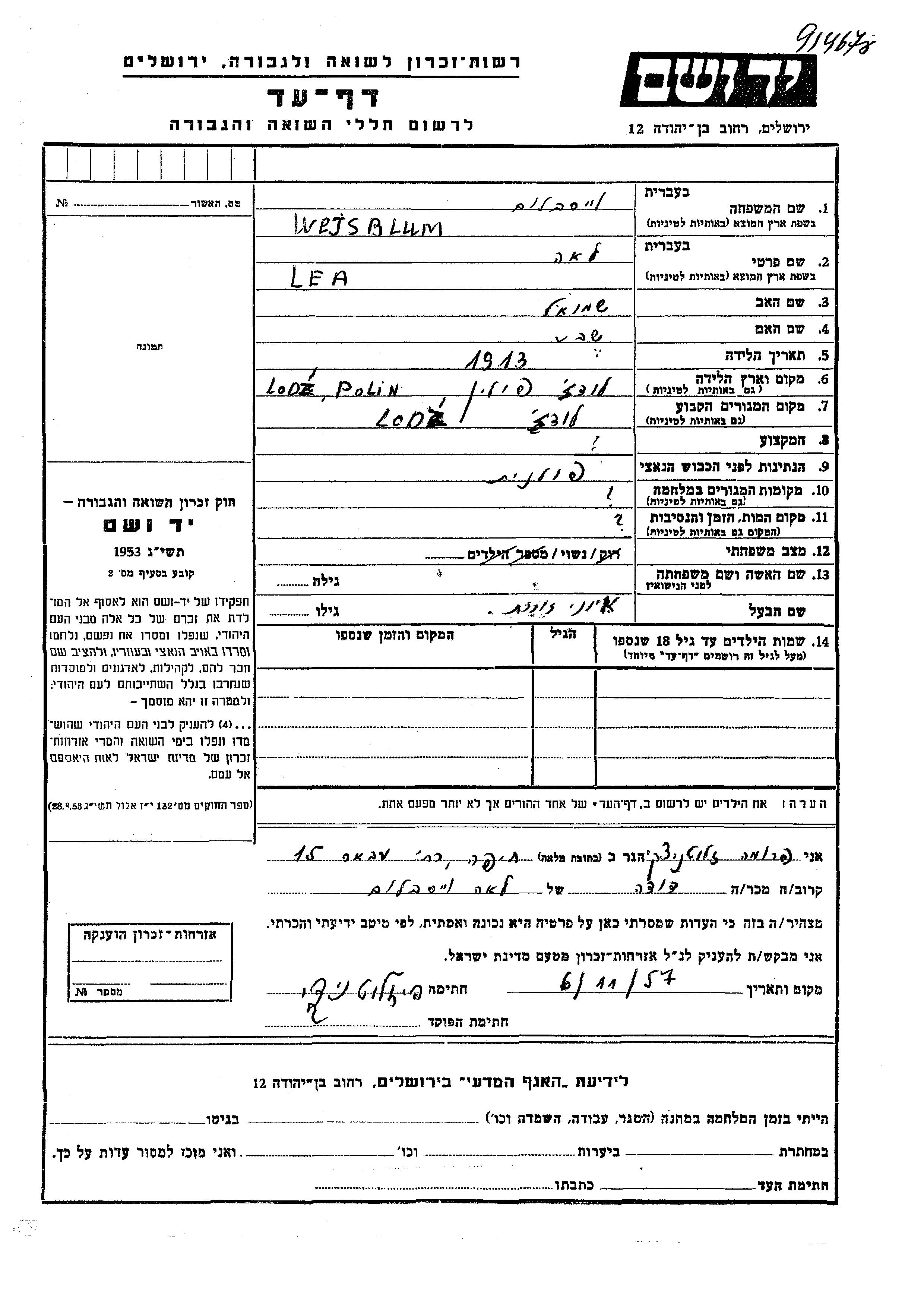 Wejsblum לאה 1913 Lodz, פולין דף-עד