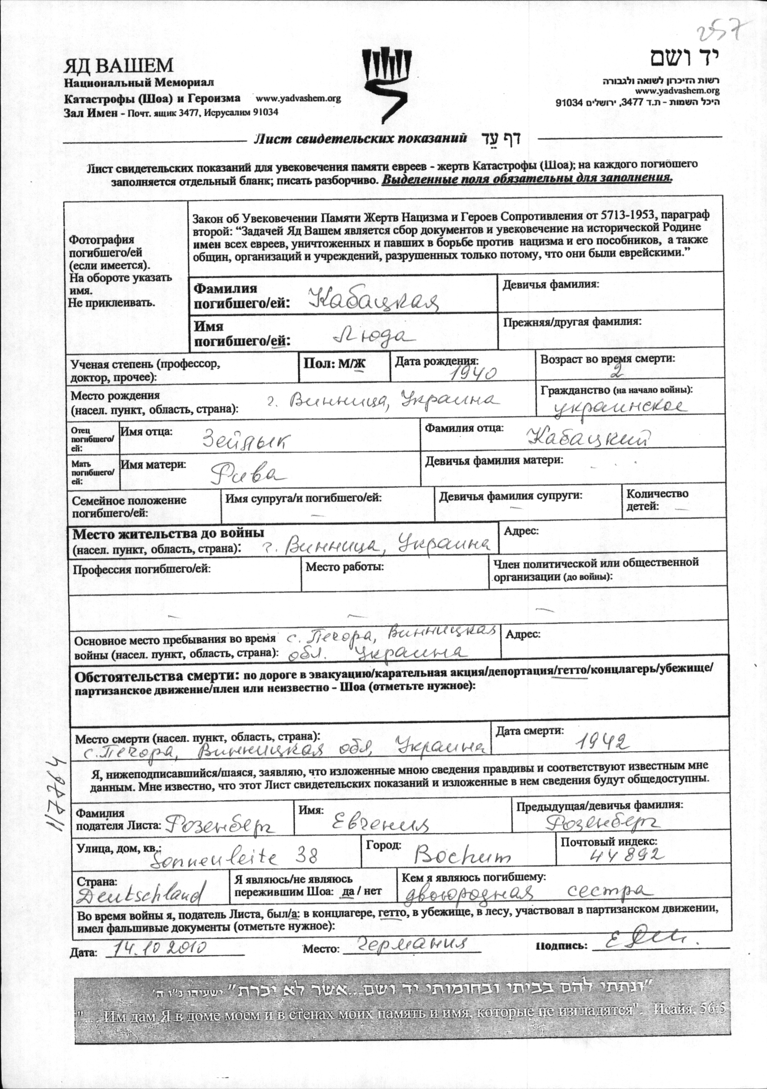 Lyuda Kabatzkaya נולדה בVinnitsa שבאוקראינה (ברה"מ) בשנת 1940 לZeylyk וריבה. היא היתה ילדה. לפני מלחמת העולם השניה התגוררה בVinnitsa שבאוקראינה (ברה"מ). בזמן המלחמה היא היתה בגטו,<>. היא נרצחה בשואה. מקום המוות: Pechora שבאוקראינה (ברה"מ) בשנת 1942.