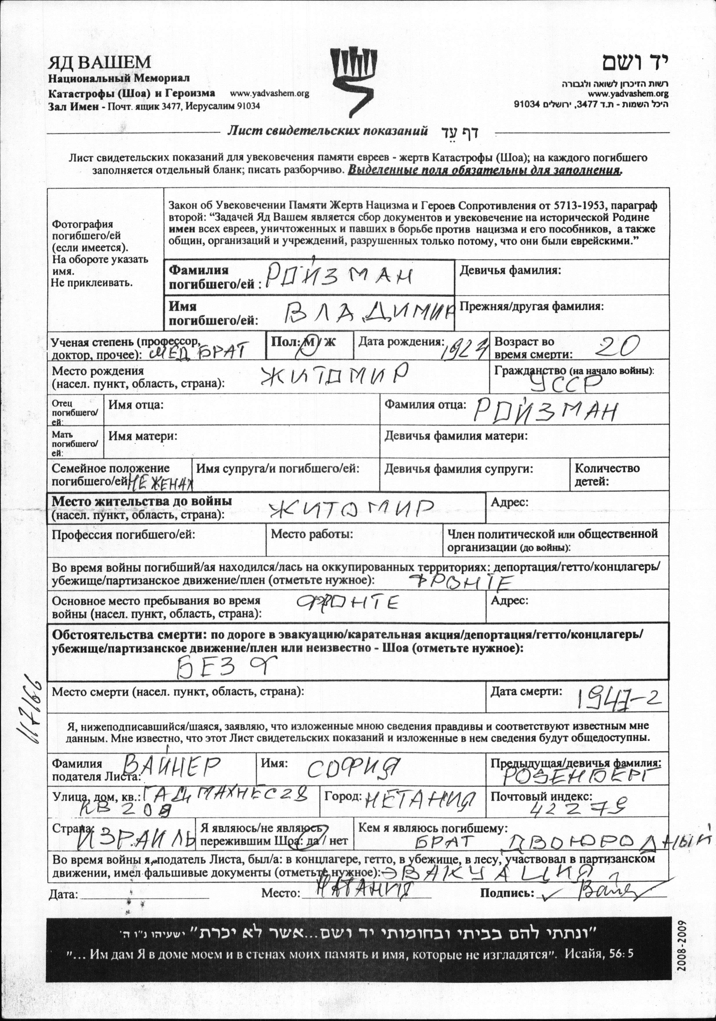 ולדימיר נרצח בשואה. מקום המוות: לא ידוע בשנת 1942.