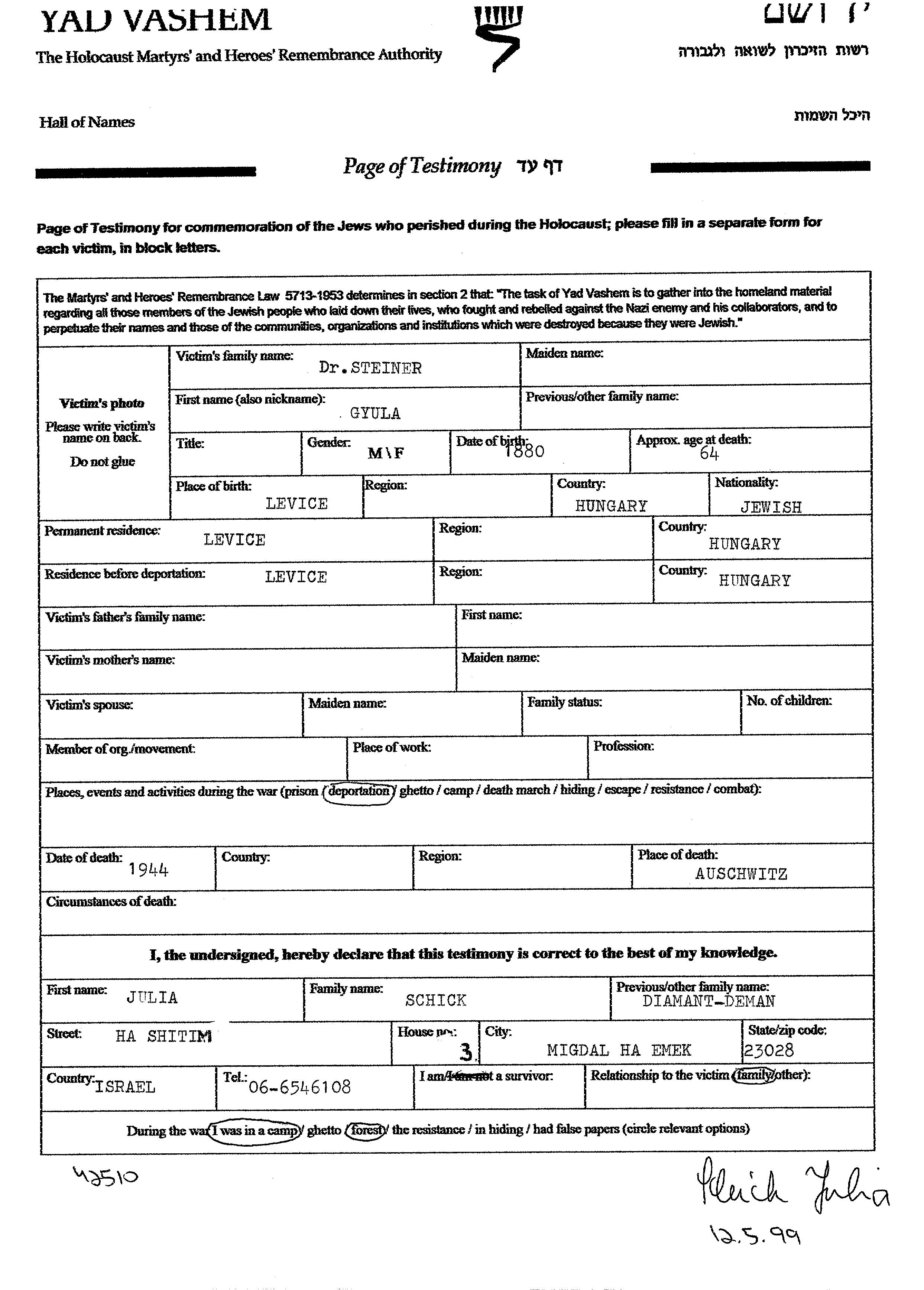 דר. Steiner נרצח בשואה. מקום המוות: Auschwitz שבפולין בשנת 1944.