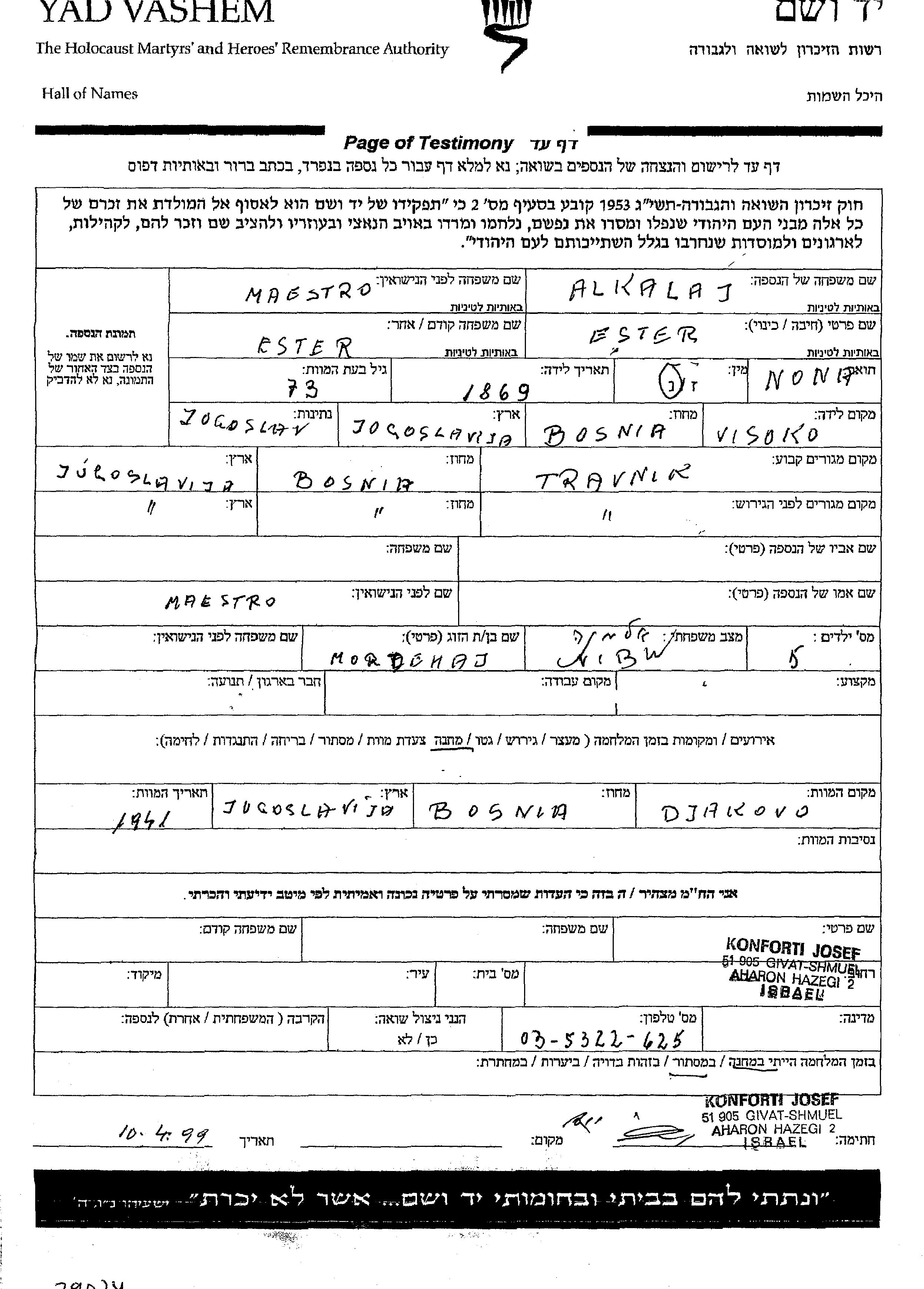 Alkalaj אסתר 1869 Travnik, יוגוסלביה דף-עד
