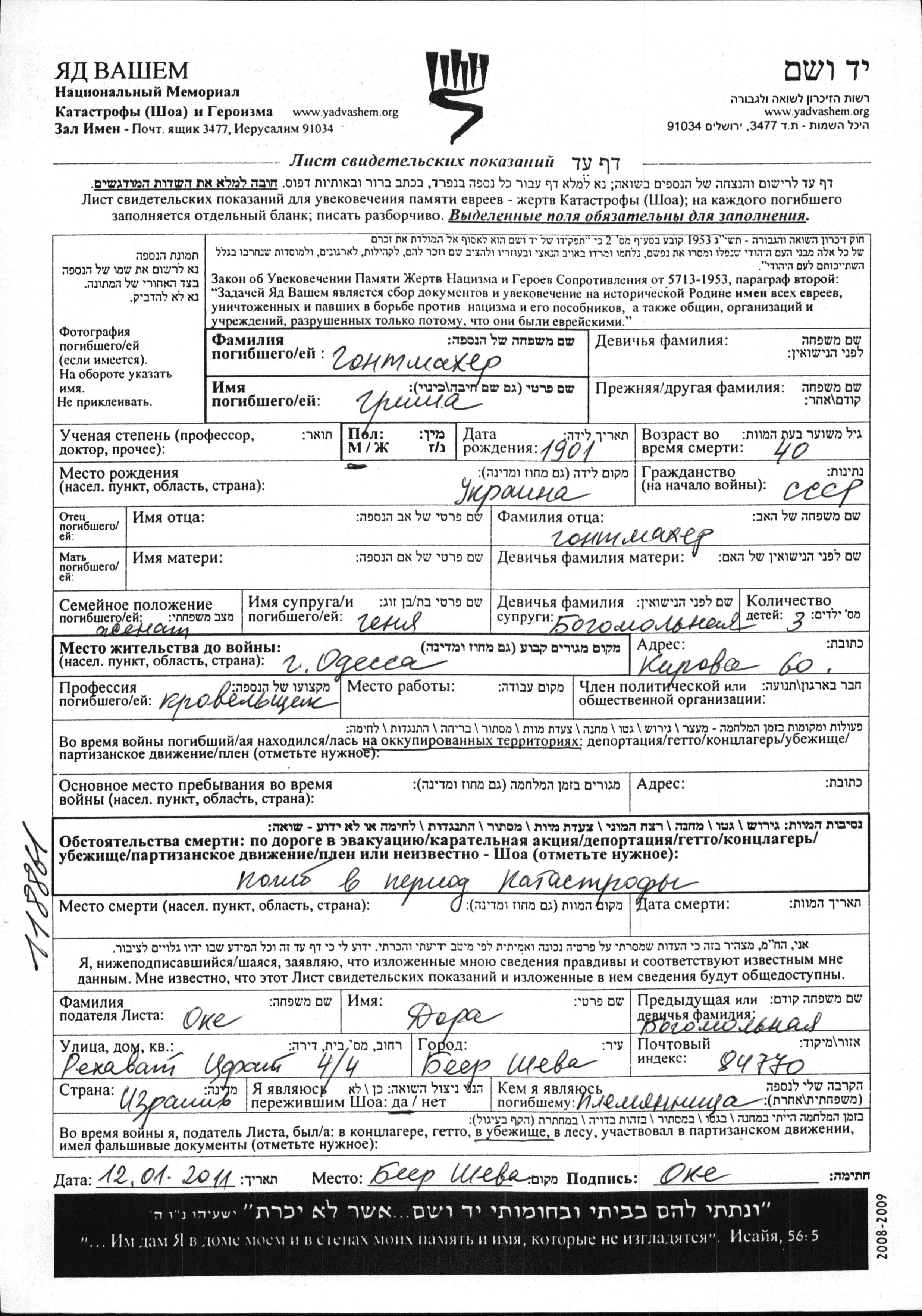 Grisha גונטמכר נולד באוקראינה (ברה"מ) בשנת 1901. הוא היה גגן ונשוי לגניה לבית Bogomolnaya. לפני מלחמת העולם השניה התגורר בOdessa שבאוקראינה (ברה"מ). בזמן המלחמה הוא היה באוקראינה (ברה"מ). הוא נרצח בשואה.