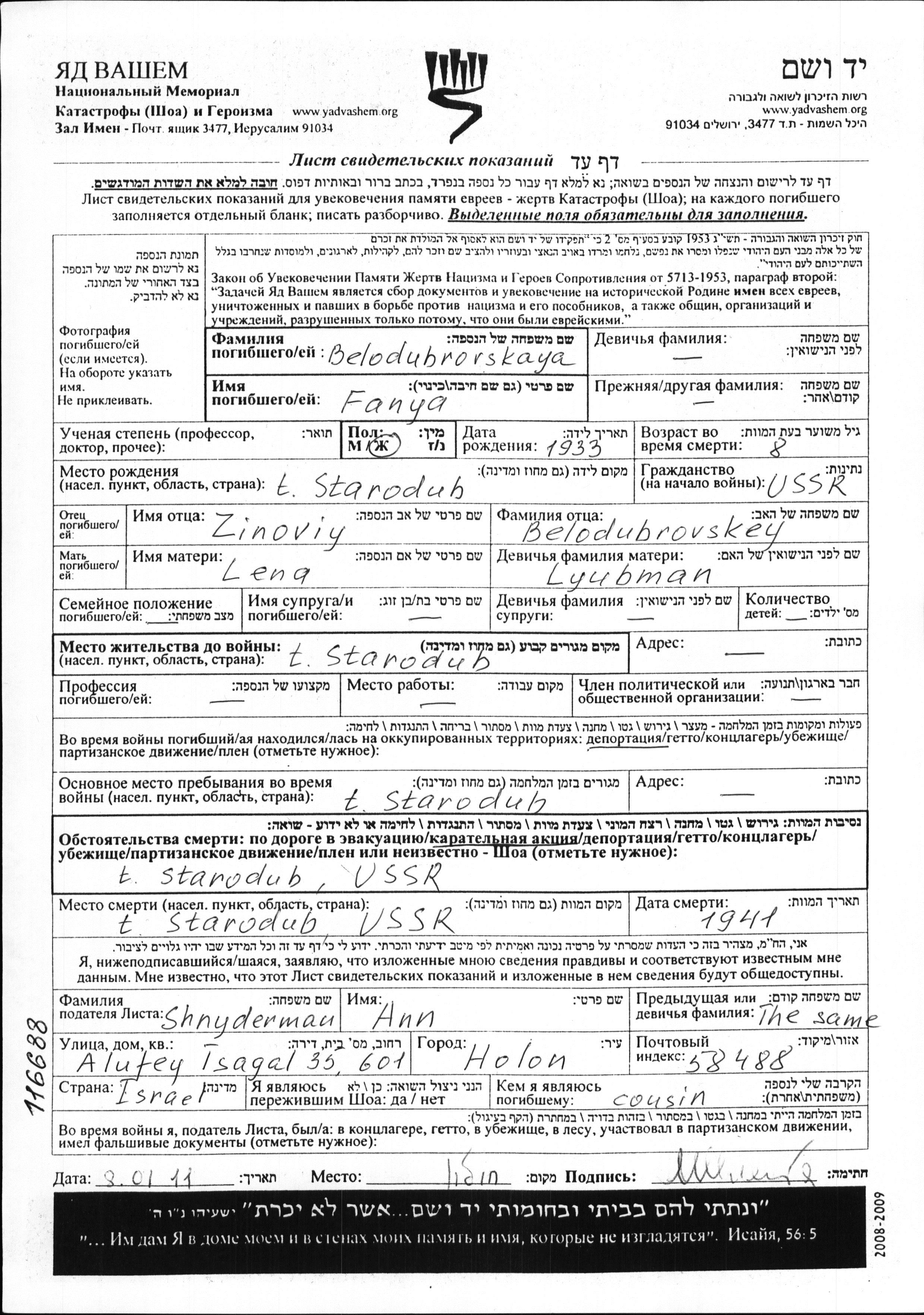Fanya Belodubrovskaya נולדה בStarodub שבברית המועצות בשנת 1933 לZinoviy ולנה לבית Lyubman. היא היתה ילדה. לפני מלחמת העולם השניה התגוררה בStarodub שבברית המועצות. היא נרצחה בשואה. מקום המוות: Starodub שבברית המועצות בשנת 1941.