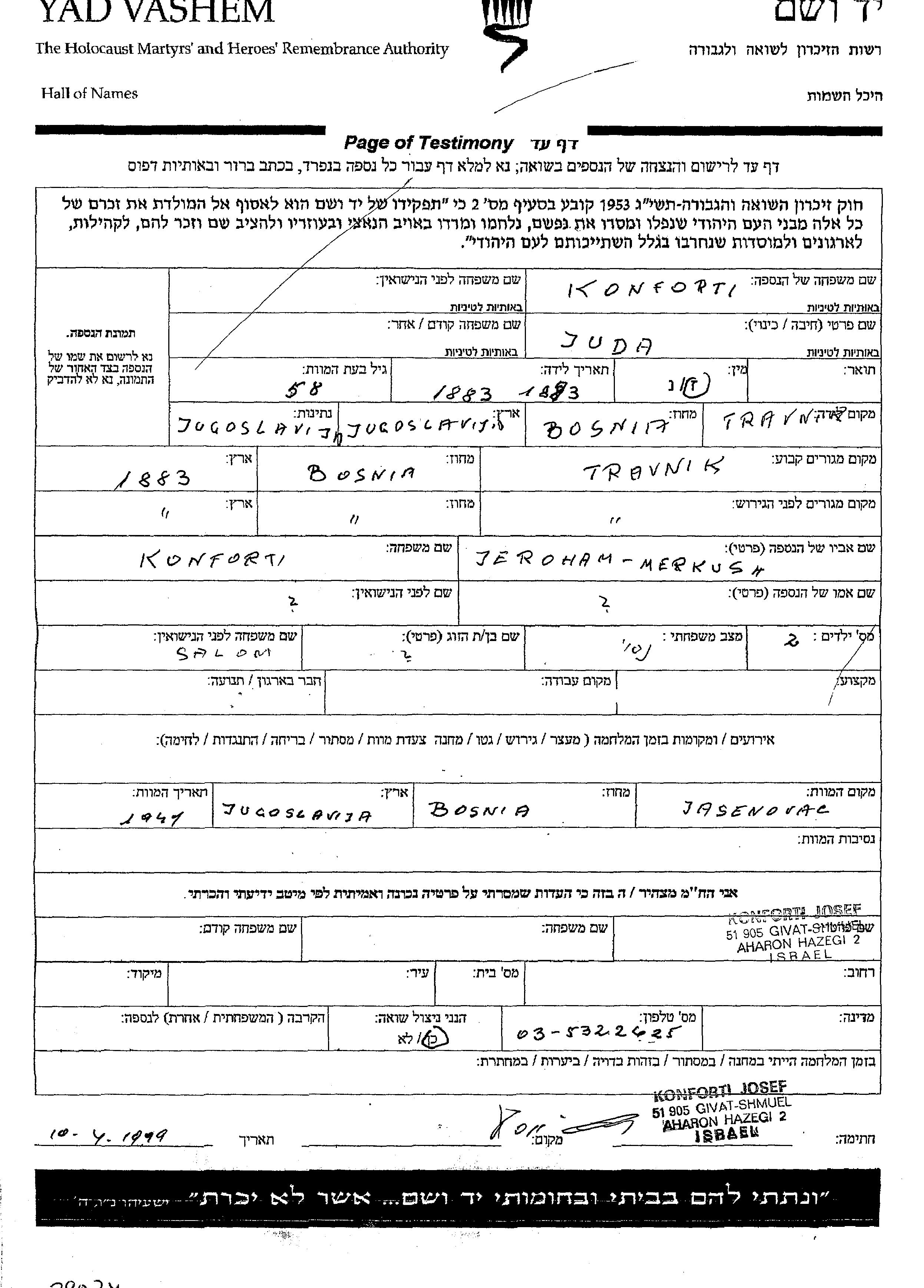 Juda קונפורטי נולד בTravnik שביוגוסלביה בשנת 1883 לJeroham Merkus. הוא היה נשוי. לפני מלחמת העולם השניה התגורר בTravnik שביוגוסלביה. בזמן המלחמה הוא היה בTravnik שביוגוסלביה.