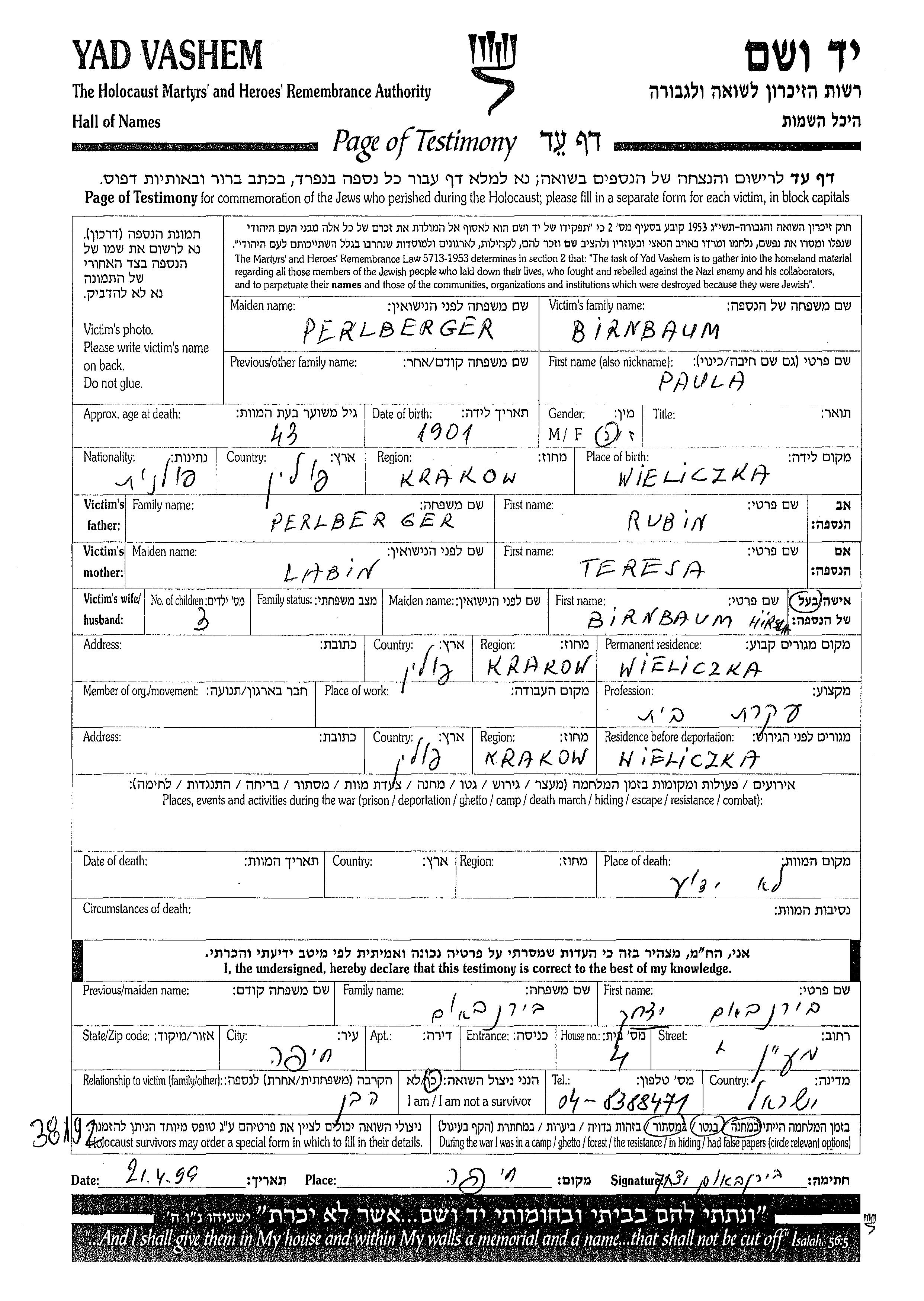 פאולה בירנבאום לבית פרלברגר נולדה בWieliczka שבפולין בשנת 1901 לRubin וTeresa. היא היתה עקרת בית ונשואה לHirsch. לפני מלחמת העולם השניה התגוררה בWieliczka שבפולין. בזמן המלחמה היא היתה בWieliczka שבפולין.
