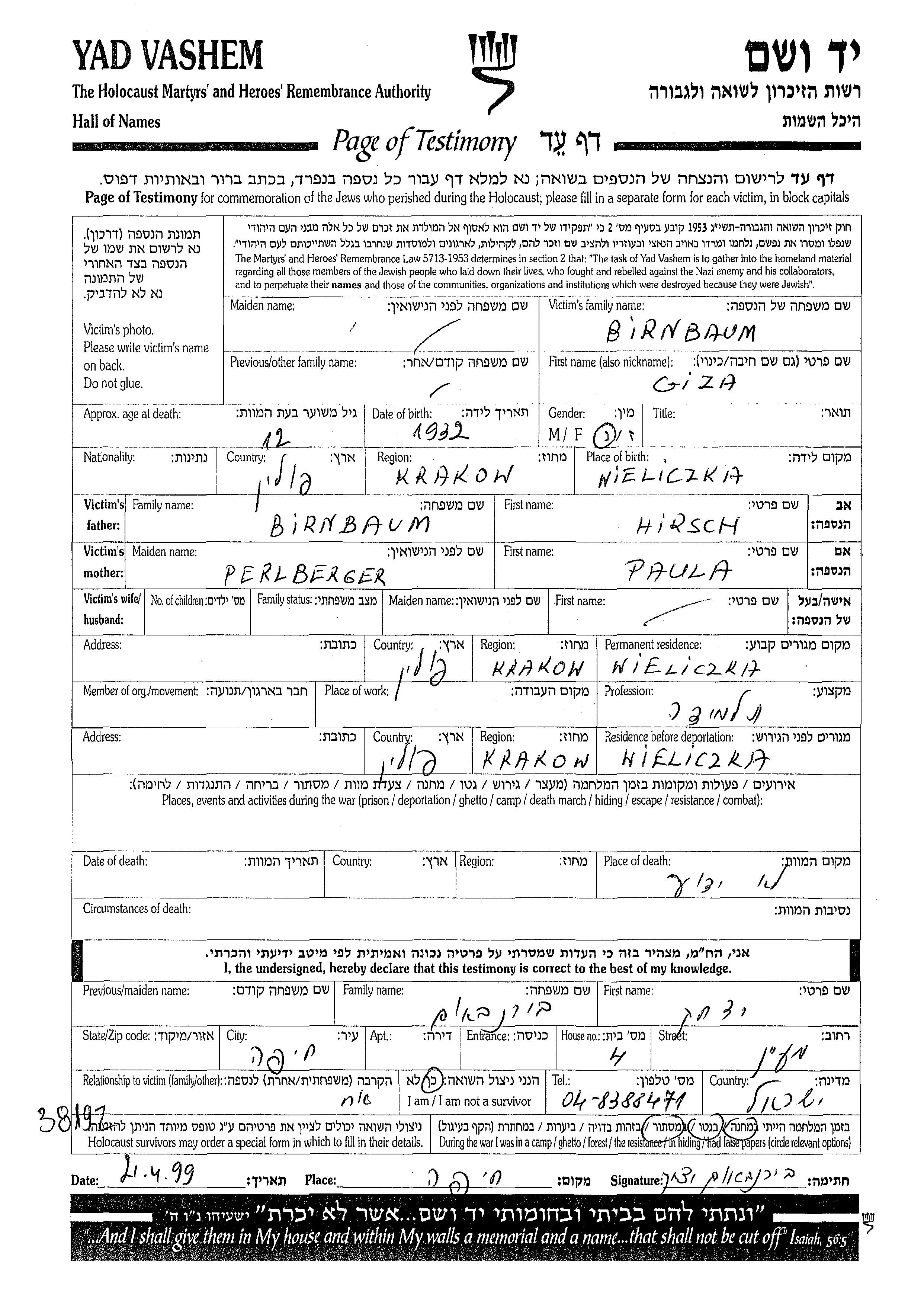 Giza בירנבאום נולדה בWieliczka שבפולין בשנת 1932 לHirsch ופאולה. היא היתה תלמידה. לפני מלחמת העולם השניה התגוררה בWieliczka שבפולין. בזמן המלחמה היא היתה בWieliczka שבפולין.
