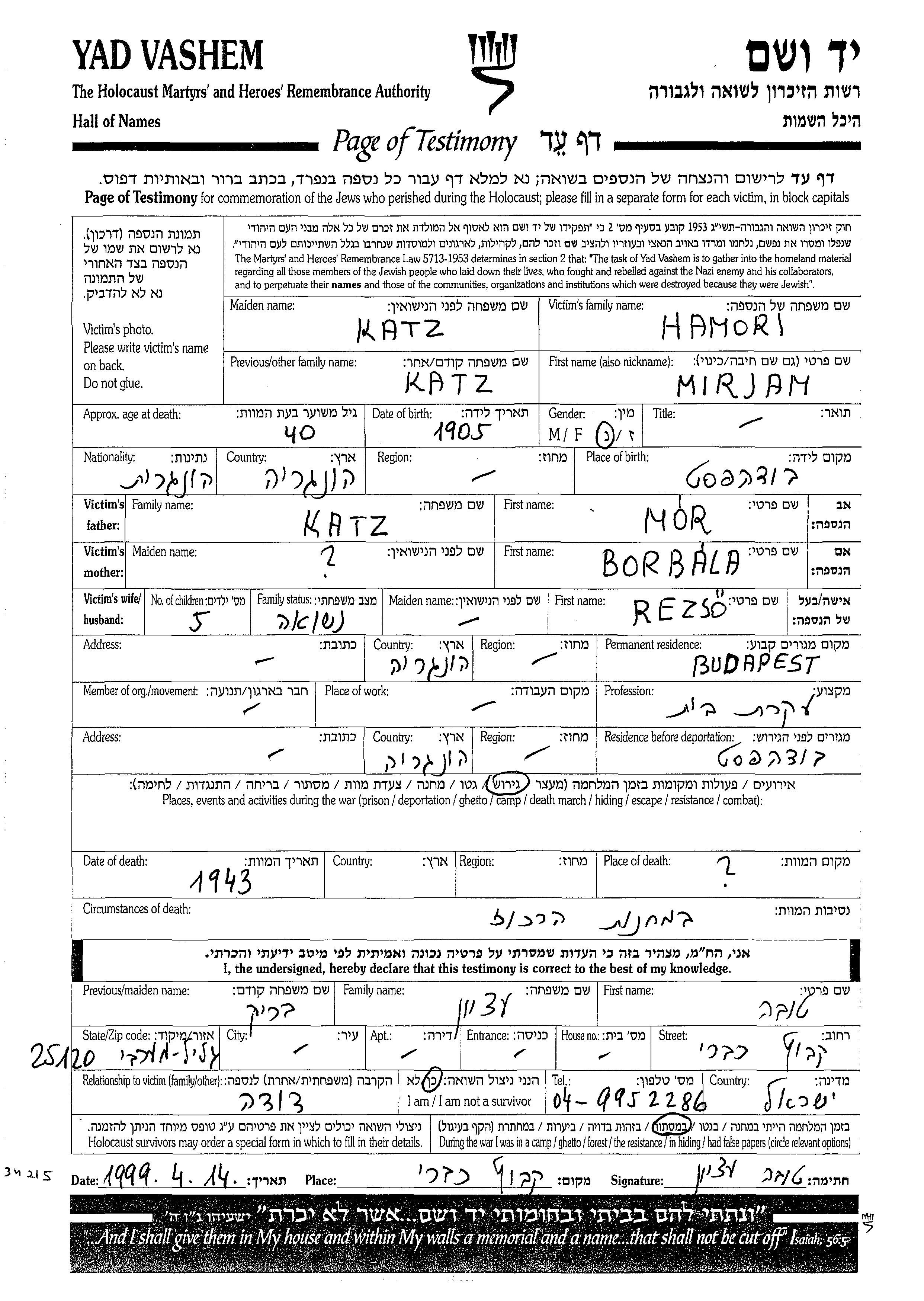 Mirjam המורי לבית כץ נולדה בBudapest שבהונגריה בשנת 1905 למור ובורבלה. היא היתה עקרת בית ונשואה לRezso. לפני מלחמת העולם השניה התגוררה בBudapest שבהונגריה. בזמן המלחמה היא היתה בBudapest שבהונגריה.