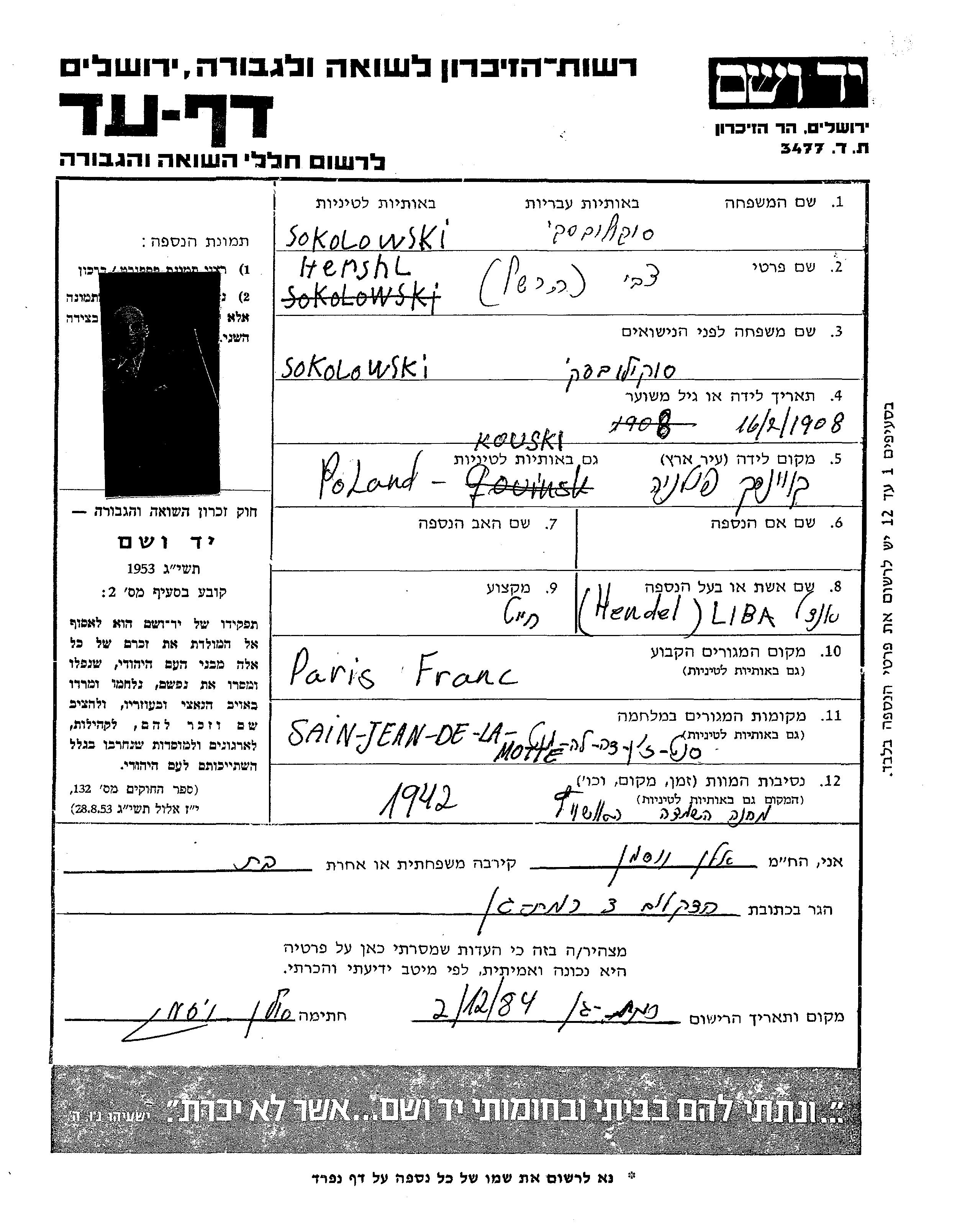 | Sokolowski | Hershl צבי | 1908 | Paris, צרפת | דף-עד |