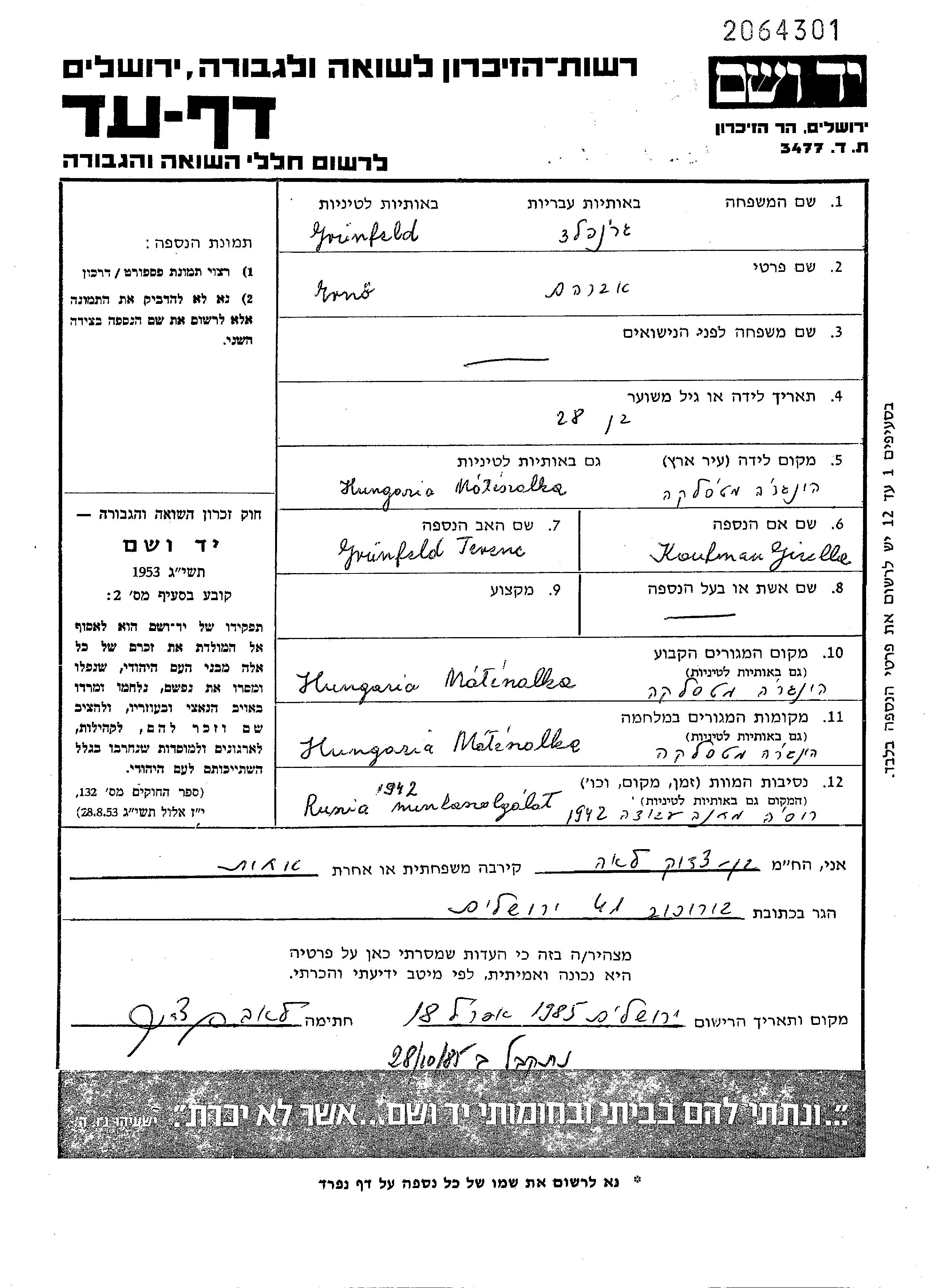 Gruenfeld ארנו אברהם 1915 Mateszalka, הונגריה דף-עד