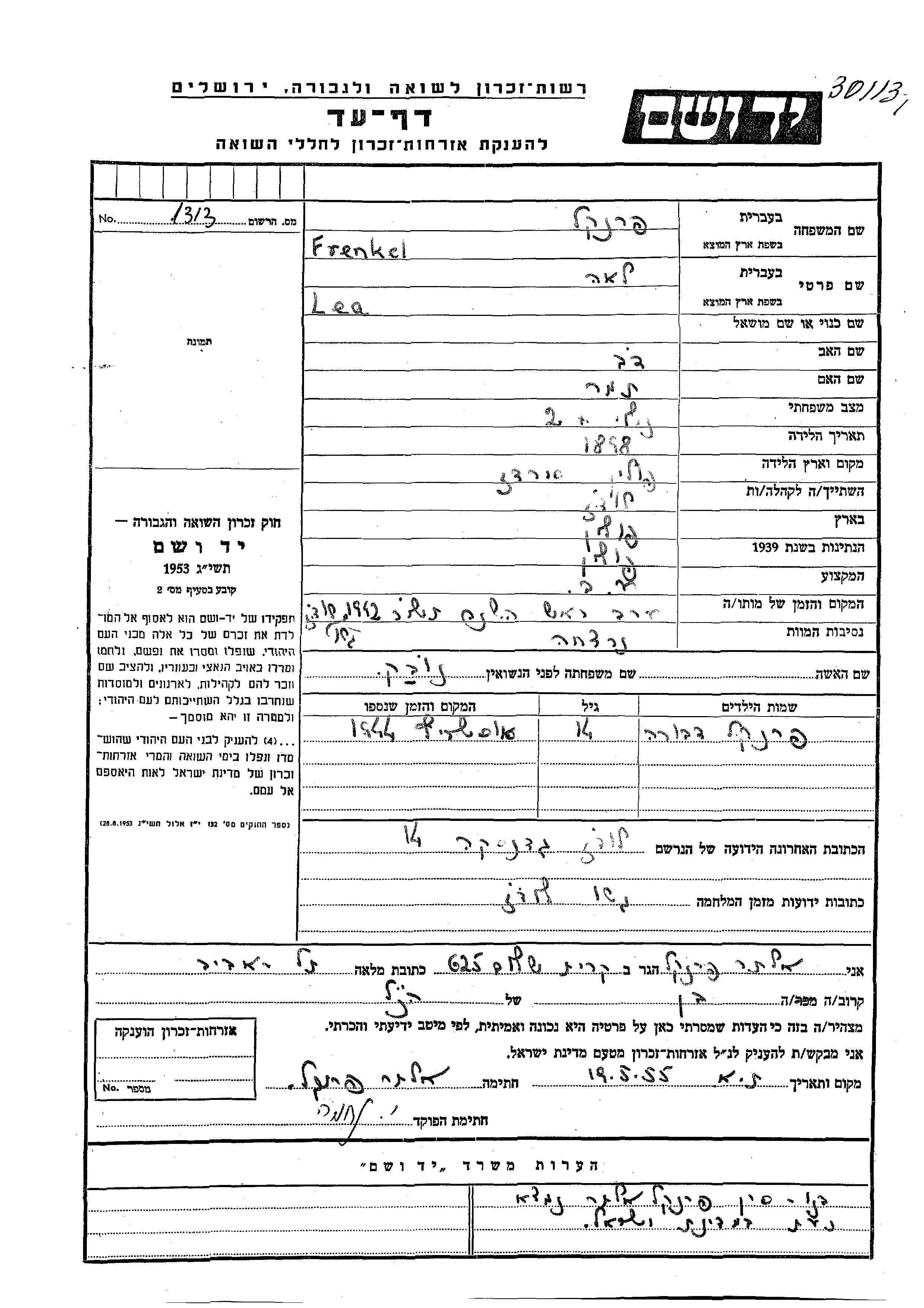 לאה נרצחה בשואה. מקום המוות: לא ידוע בשנת 1942.