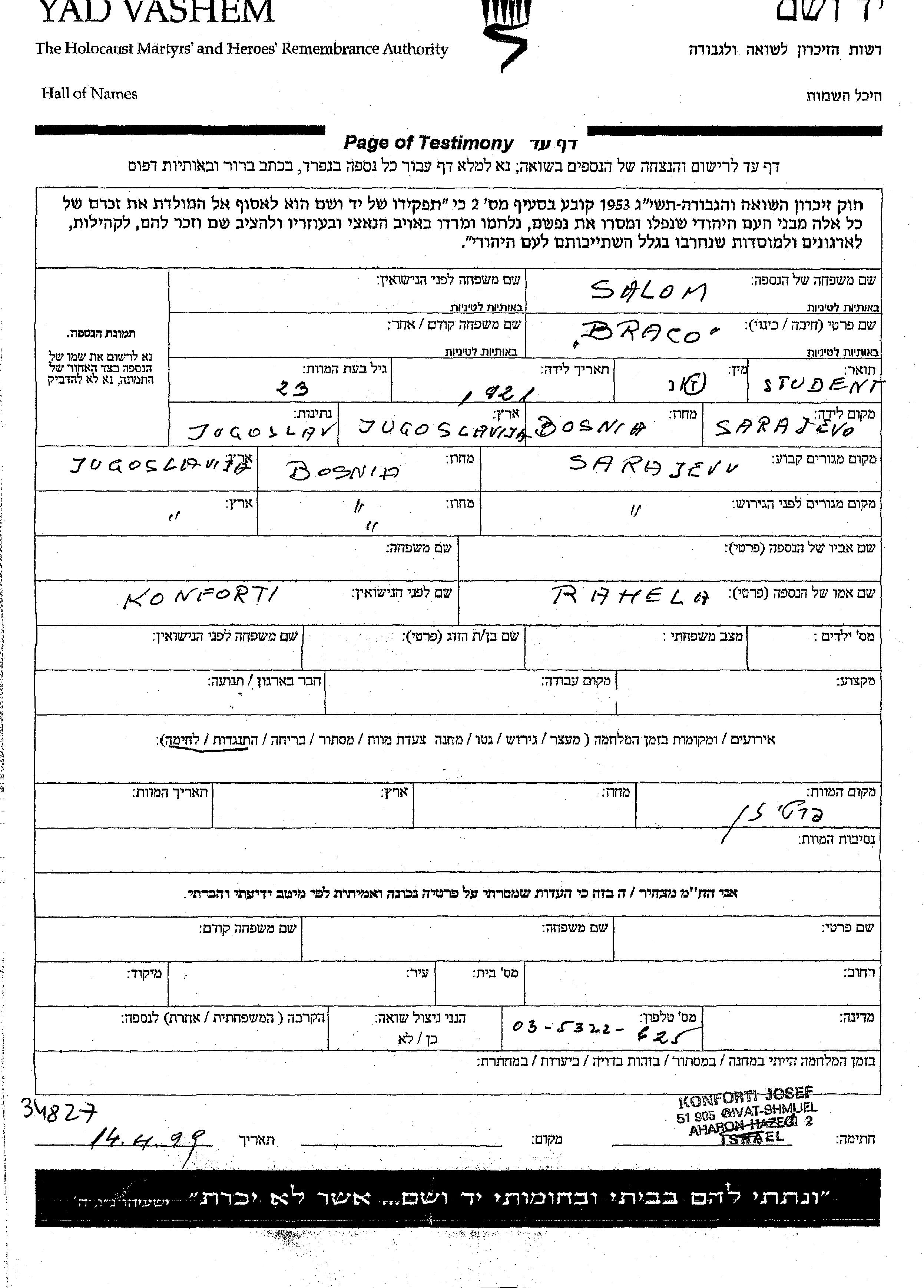 Braco סלום נולד בSarajevo שביוגוסלביה בשנת 1921 לRahela. הוא היה סטודנט. לפני מלחמת העולם השניה התגורר בSarajevo שביוגוסלביה. בזמן המלחמה הוא היה בSarajevo שביוגוסלביה.