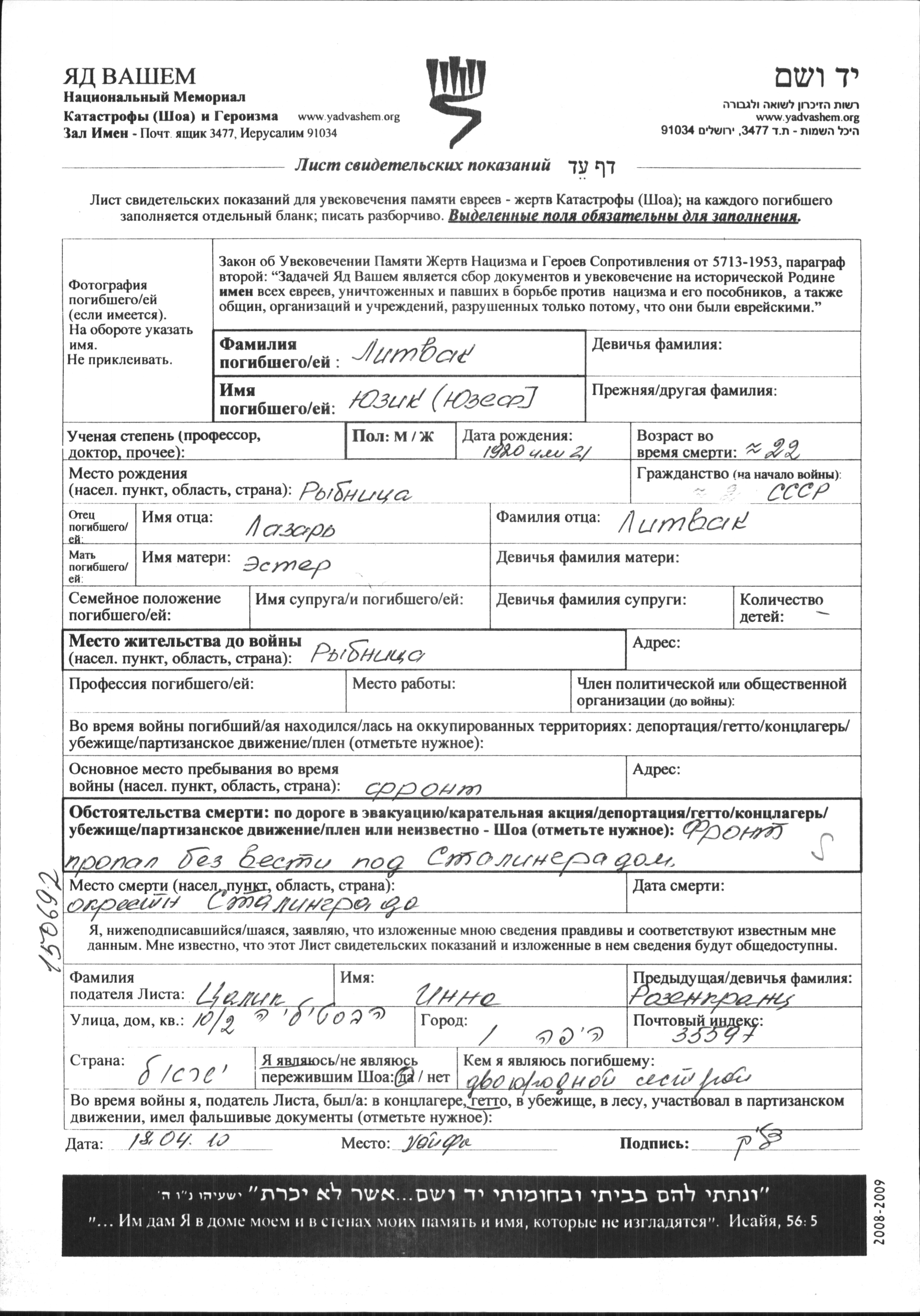הוא נרצח בשואה. מקום המוות: Stalingrad שברוסיה (ברה"מ).