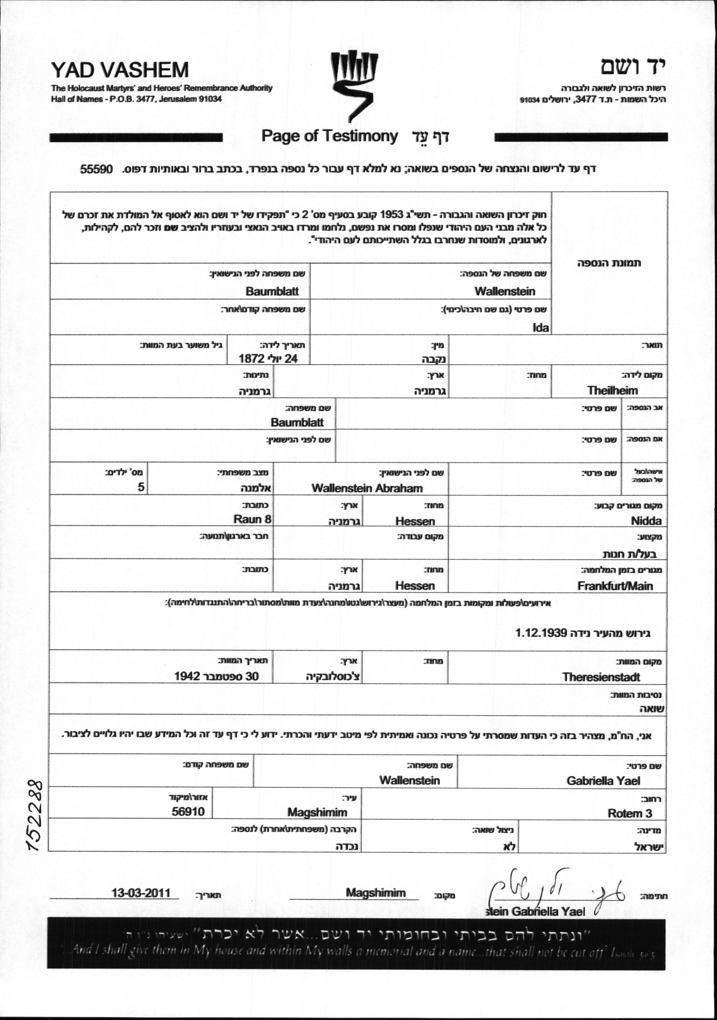 Ida Wallenstein לבית Baumblatt נולדה בTheilheim שבגרמניה בשנת 1872. היא היתה בעלת חנות ואלמנה לAbraham. לפני מלחמת העולם השניה התגוררה בNidda שבגרמניה. בזמן המלחמה היא היתה בFrankfurt am Main שבגרמניה.