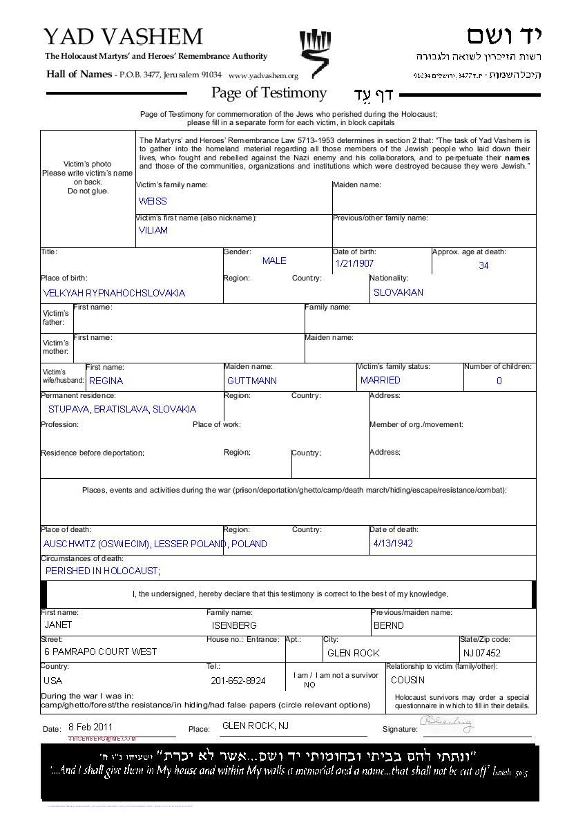 Viliam Weiss נולד בVelky Ripnany שבצ'כוסלובקיה בשנת 1907. הוא היה נשוי לרגינה לבית Guttmann. לפני מלחמת העולם השניה התגורר בStupava שבצ'כוסלובקיה.