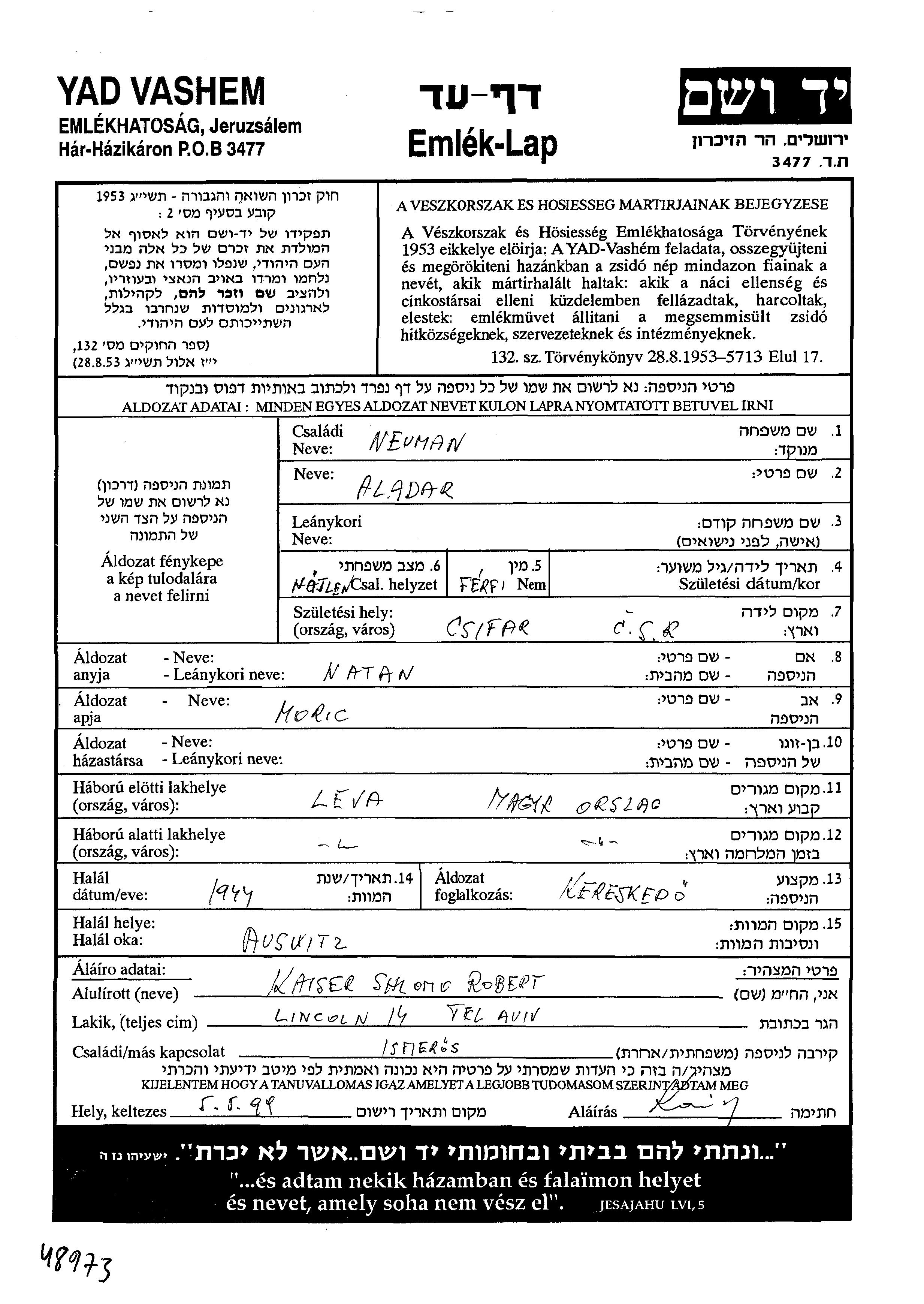 אלדר Neuman נולד לMoric ונתן. הוא היה סוחר ורווק. לפני מלחמת העולם השניה התגורר בLeva שבצ'כוסלובקיה. בזמן המלחמה הוא היה בLeva שבצ'כוסלובקיה.