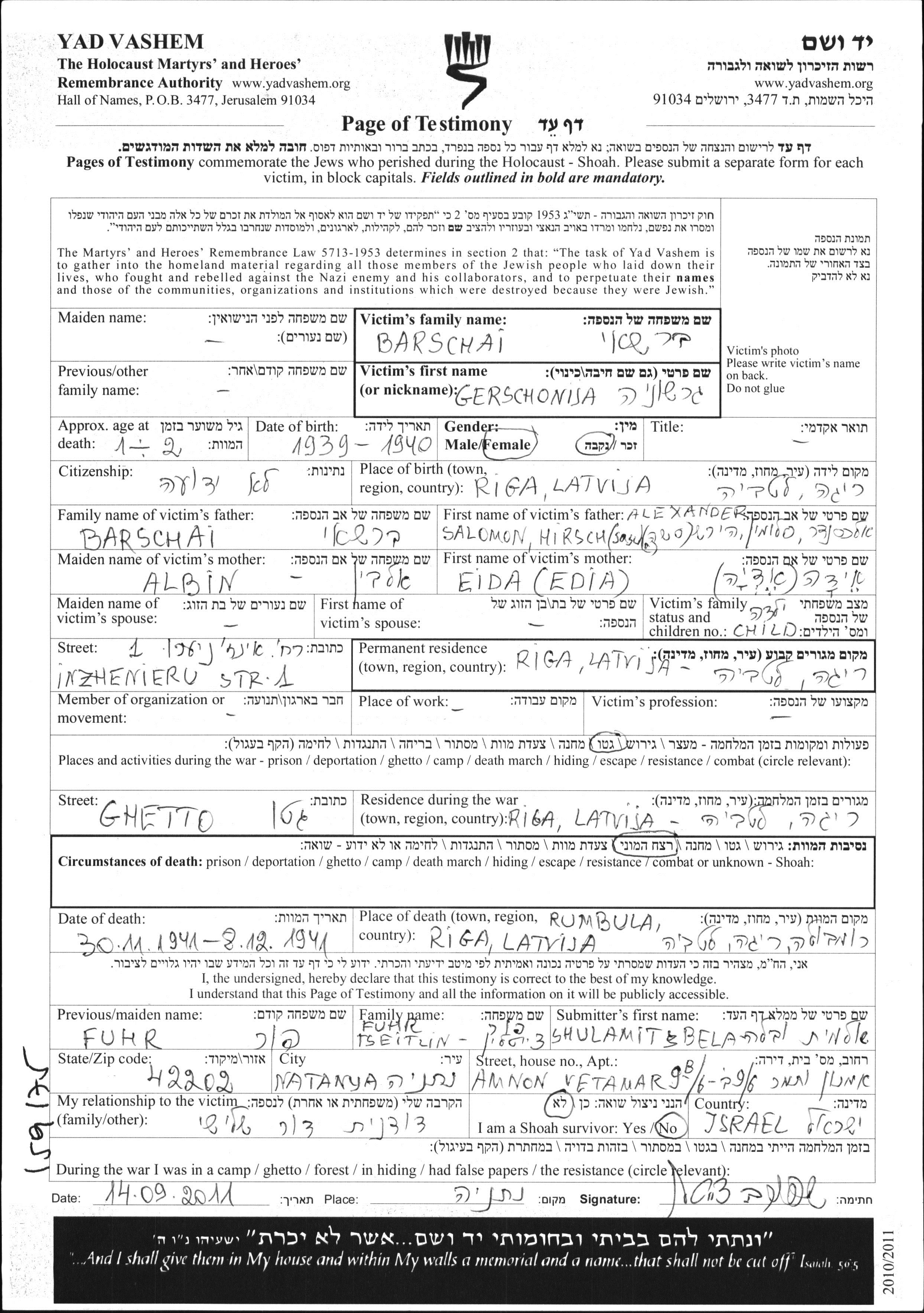 Gerschonija גרשוניה Barschai נולדה בRiga שבלטביה בשנת 1940 לAlexander סלומון סאשה Hirsch וEida לבית אלבין. היא היתה תינוקת. לפני מלחמת העולם השניה התגוררה בRiga שבלטביה. בזמן המלחמה היא היתה בRiga שבלטביה. היא נרצחה בשואה. מקום המוות: Rumbula שבלטביה בשנת 12/1941.