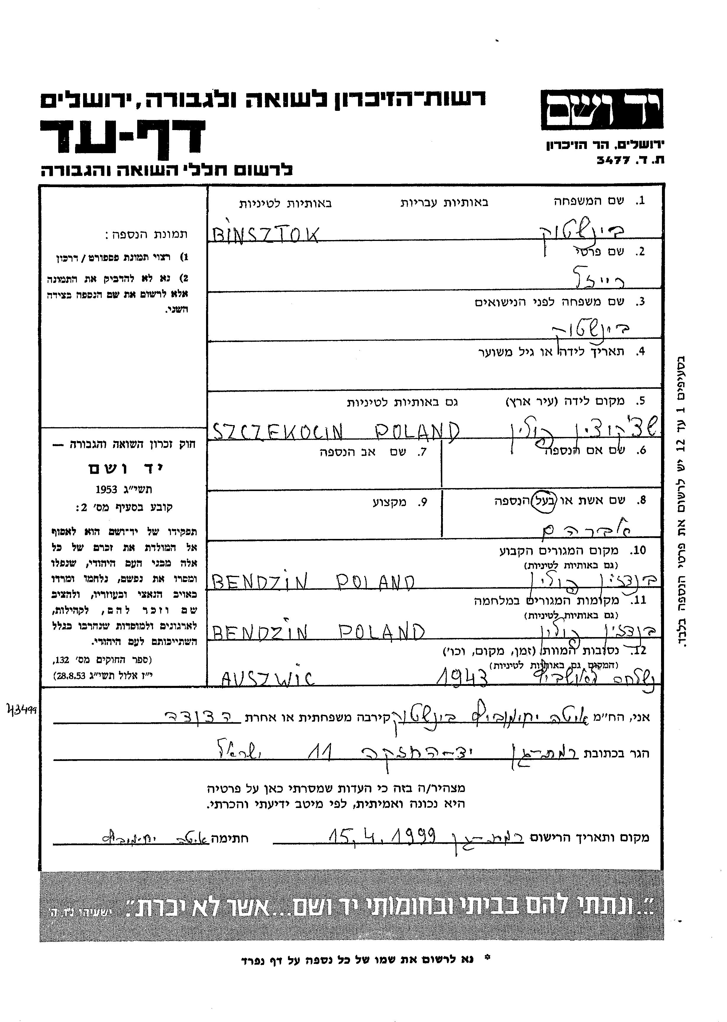 רייזל Binsztok נולדה בSzczekocin שבפולין. היא היתה נשואה לאברהם. לפני מלחמת העולם השניה התגוררה בBendzin שבפולין. בזמן המלחמה היא היתה בBendzin שבפולין.